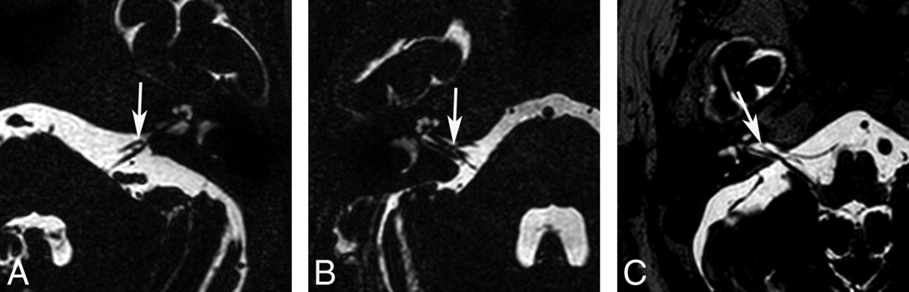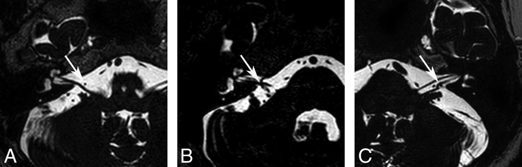 Neurovascular contact types between the AICA and the cochleovestibular nerve. A, A type I neurovascular contact shows no neurovascular contact (arrow). B, A type II neurovascular contact shows contact (arrow) between the AICA and the cochleovestibular nerve without angulation/indentation of the nerve. C, A type III neurovascular contact shows angulation/indentation (arrow) of the cochleovestibular nerve by the AICA loop.