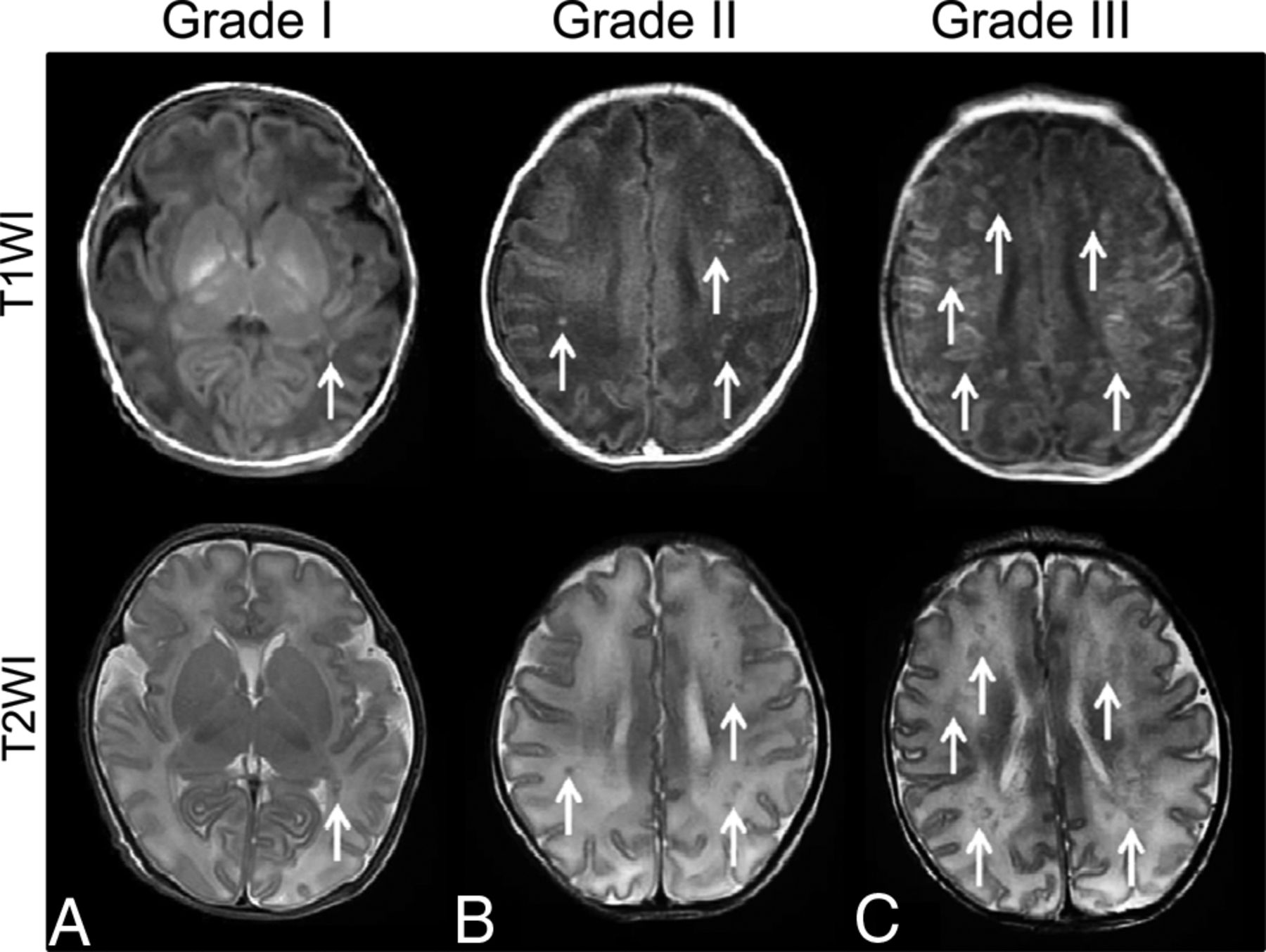 The appearances of 3 PWML grades (A, grade I; B, grade II; C, grade III) on T1WI and T2WI.