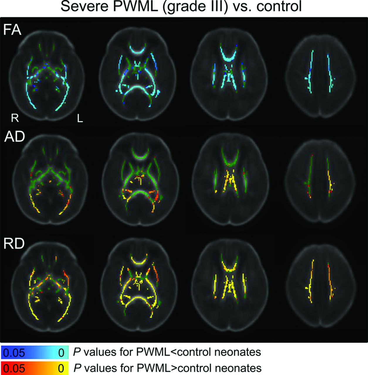 Changes in DTI metrics (FA, AD, and RD) in preterm neonates with severe PWMLs compared with controls revealed by TBSS (there were no significant changes in neonates with PWML grades I and II). Green regions represent the mean FA skeleton without any significant differences. Significant decreases in neonates with PWMLs compared with controls are shown in cool colors (blue and light blue). Significant increases in neonates with PWMLs compared with controls are shown in warm colors (red and yellow).
