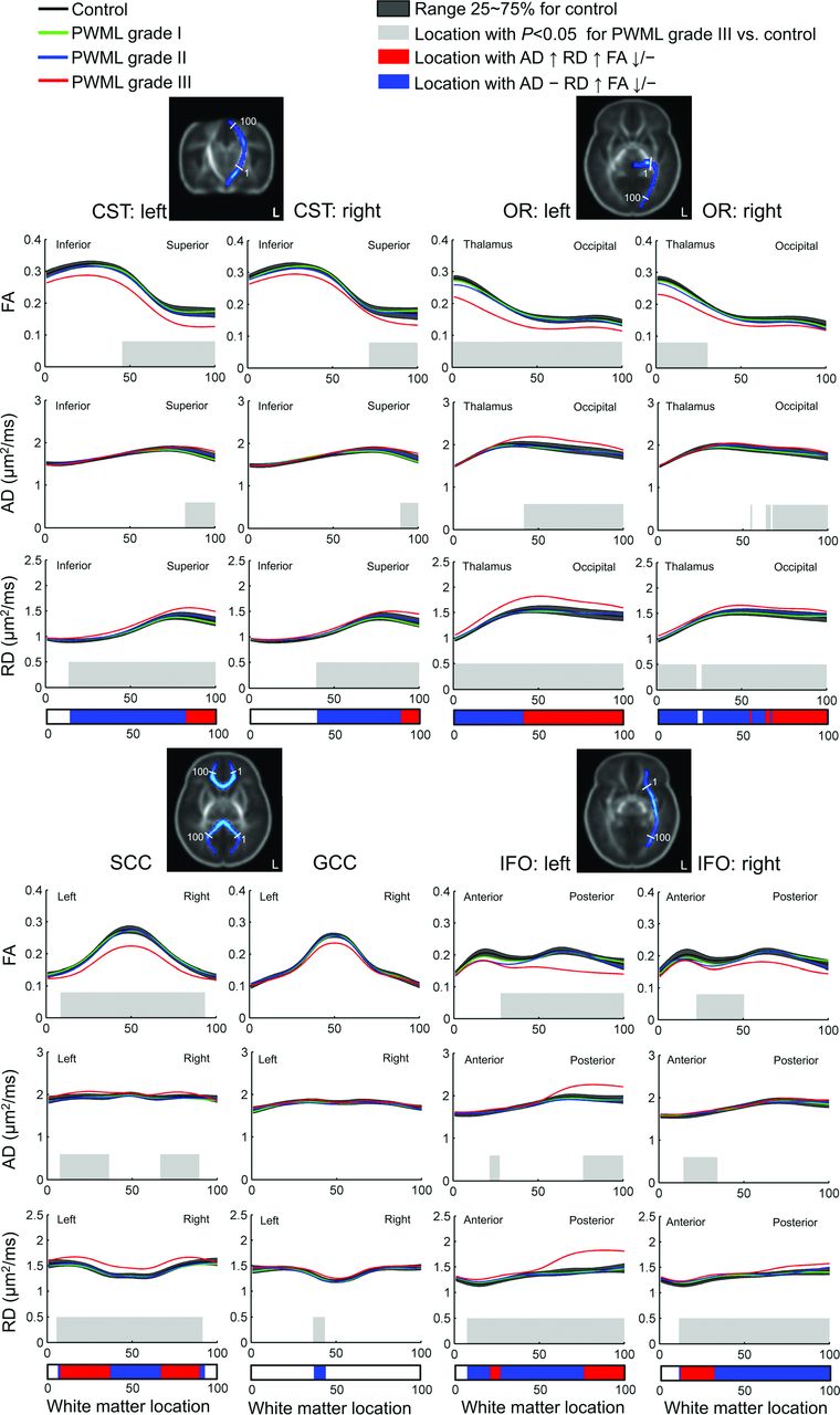 Different patterns of microstructural changes associated with severe PWMLs (grade III) were found along white matter tracts (Fig 3). Increased AD, increased RD, and reduced/unchanged FA were found in the superior part of the CST, the occipital proximal region of the OR, the peripheral regions of the SCC near the lateral ventricles, the anterior and posterior regions of the left IFO, and the anterior region of the right IFO. Unchanged AD, increased RD, and unchanged/reduced FA were observed in the posterior limb of the internal capsule part of the CST, the region of the OR proximal to the thalamus, central regions of the SCC and GCC, the central region of the left IFO, and the central and posterior regions of the right IFO.