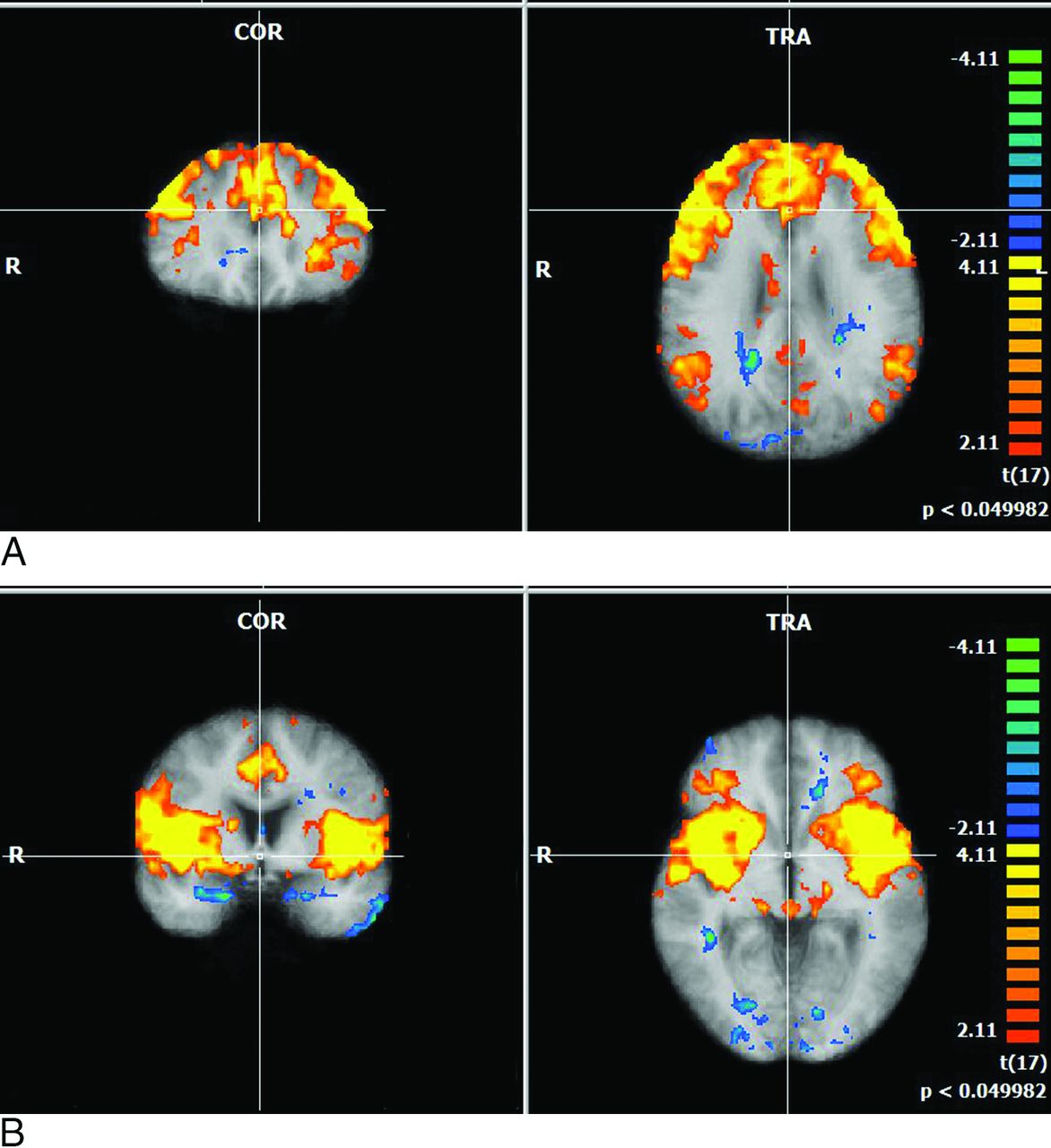 Multiplanar and axial depictions of differences between patients with HIV and control subjects in Brodmann area 9 (executive networks) and Brodmann area 13 (salience networks). Positive values represent higher correlation, and negative values depict lower correlation in patients with HIV relative to control subjects. (All the resultant maps are cluster-corrected). A, Brodmann area 9: patients-controls. B, Brodmann area 13: patients-controls.