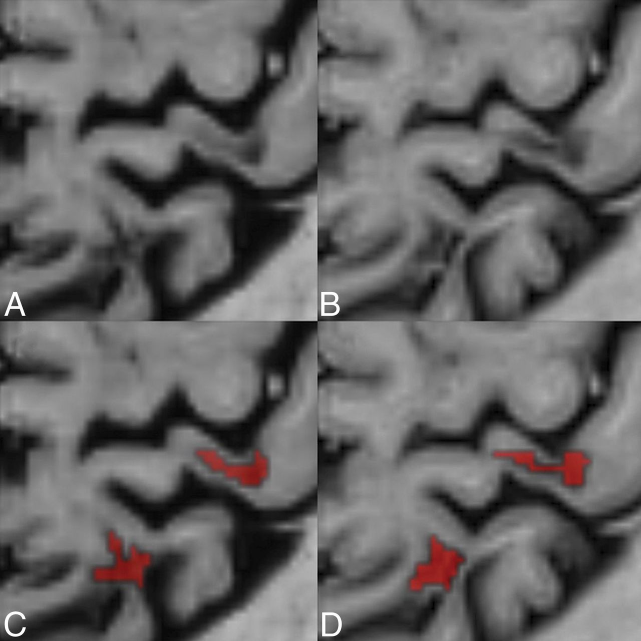 Comparison between conventional and synthetic phase-sensitive inversion recovery. A comparison between conventional (B and D) and synthetic phase-sensitive inversion recovery (A and C) illustrates 2 leukocortical MS lesions in a 40-year-old female patient with MS. Lower row illustrates the manual segmentation of the lesions by a neuroradiologist.