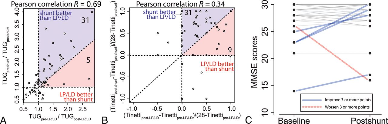 Quantitative assessment for LP/LD and shunt response. A, Comparison between the improvement in TUG scores after LP/LD (x-axis) and after shunt surgery (y-axis). Thirty-one patients show better improvement after shunt surgery than after LP/LD, whereas 5 patients show better improvement after LP/LD than after shunt surgery. B, Comparison between the improvement in the Tinetti score “deficit” after LP/LD (x-axis) and after shunt surgery (y-axis). Patients with a Tinetti score of 28 at baseline and 2 outliers (−1.4, 0.6) and (−1, −2) are not shown on this graph. Thirty-one patients show better improvement after shunt surgery than after LP/LD, whereas 9 patients show better improvement after LP/LD than after shunt surgery. C, Changes in the MMSE score after shunt surgery. Blue lines represent patients who improved, and red lines represent patients who worsened by ≥3 points in the MMSE test after shunt surgery.