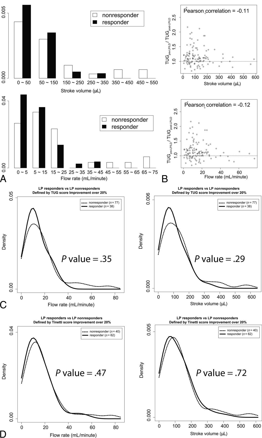 We next tested whether aqueductal CSF flow has a diagnostic or prognostic value. When they were divided into 4 quartiles based on Tinetti, TUG, and MMSE scores collected at baseline, there was no significant difference in the aqueductal flow rate and aqueductal stroke volume among quartiles (On-line Tables 1 and 2, upper 3 rows of each table). These quartiles did not demonstrate any significant differences in Tinetti, TUG, and MMSE score changes after LP/LD or shunt surgery (On-line Tables 1 and 2, lower 5 rows of each table). When we divided subjects into LP/LD responders and nonresponders based on their subjective improvement, the flow rate and stroke volume of the responders and nonresponders overlapped (Fig 3A). Most interesting, a small number of patients within the LP nonresponder group had very high aqueductal flow rates. These patients exhibited significantly higher flow rates than the LP responder group (P value = .04). Likewise, TUG score improvement after LP/LD and shunt surgery showed a weak negative correlation with respect to stroke volume and flow rate (Fig 3B and On-line Fig 1B). We performed the same analyses for shunt surgery. Patients were divided into shunt responders and nonresponders based on the symptom relief after shunt surgery, and their aqueductal flow parameters were compared (On-line Fig 1A). Similar to the LP/LD response, the flow rate and stroke volume of the shunt responders and nonresponders overlapped. The difference between the 2 groups was not significantly different for both the aqueductal flow rate and stroke volume (P value = .35 and .38, respectively). There were 4 patients within the shunt responder group exhibiting higher aqueductal flow than other study participants.