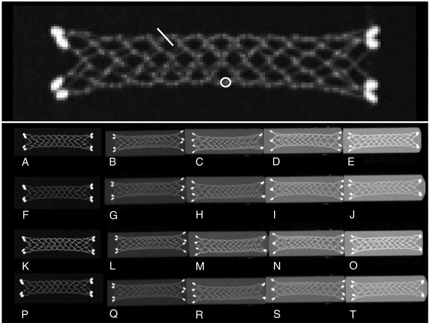 The image-processing software is freely available on-line (ImageJ, Version 1.43; National Institutes of Health; https://imageJ.nih.gov/ij/). The CNR was measured for the stent strut and the background using an ROI (0.5 × 0.5 mm) in a phantom filled with diluted contrast media (iopamidol, Iopamiron 300; Bayer Yakuhin, Osaka, Japan). The concentrations of contrast media used were 10%, 15%, 20%, and 25% diluted with saline. The CNR was measured at 5 ROIs expressed as mean ± SD. An experienced (>15 years) radiologic technologist determined the full width at half width maximum (FWHM) and CNR values and calculated the mean, SD, median, and 95% confidence interval values.