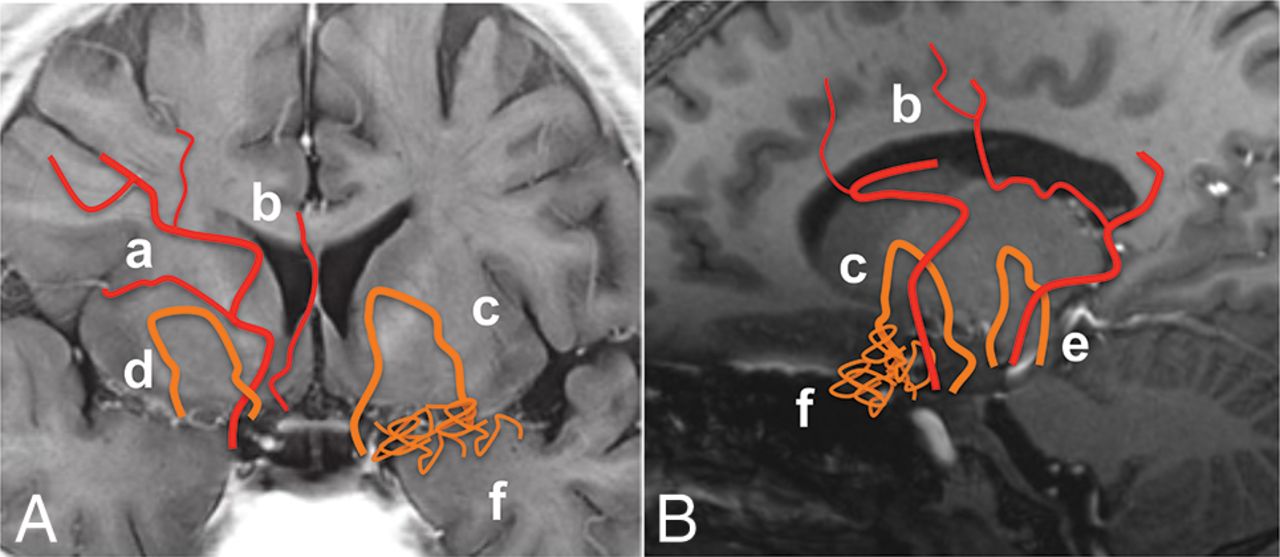 Schematic illustrations of deeply seated collateral networks are shown in coronal (A) and sagittal (B) MR imaging views. Six pathways of collateral vessels according to perfusing territories can be divided into collateral networks to cortical vessels (remote, type a and b) and to major trunk vessels (local, types c–f). Anastomoses between striate arteries or choroidal arteries and cortical arteries directly or via medullary arteries (a); septal transcallosal anastomoses between choroidal arteries with pericallosal arteries (b); anastomoses between choroidal arteries or the posterior communicating artery and thalamostriate arteries (c); intrastriatal anastomosis among striatal arteries (d); intrathalamic anastomosis among thalamic arteries (e); and focal Moyamoya vessels in the basal cistern (f).