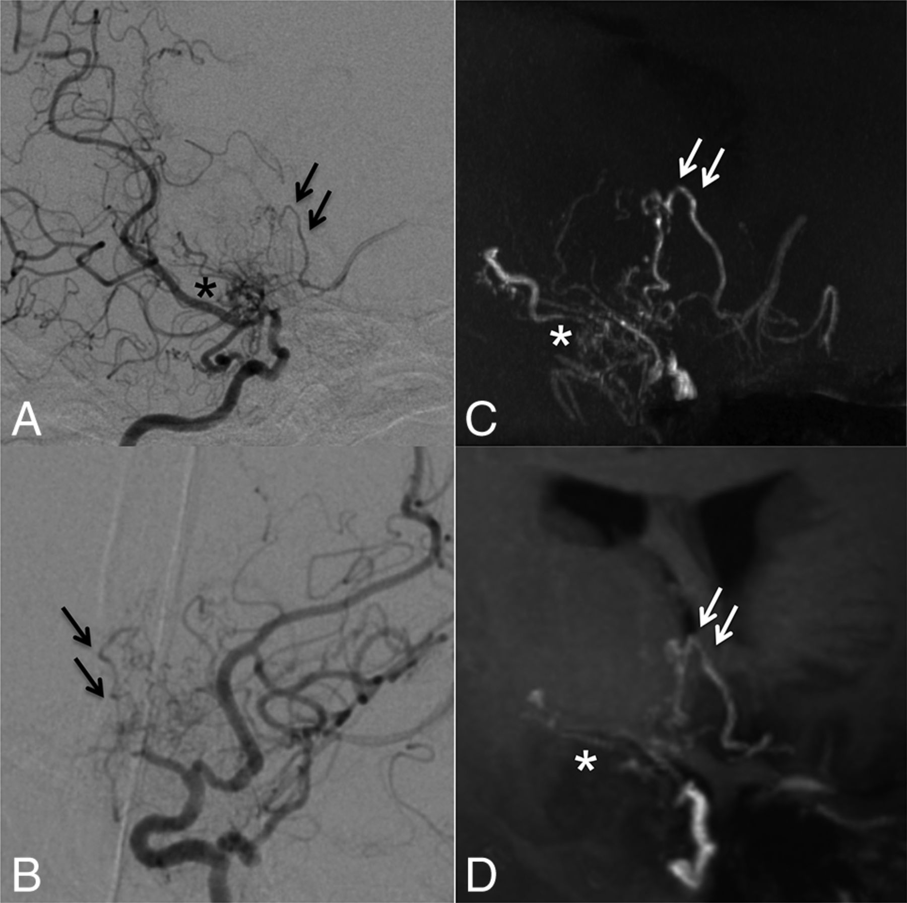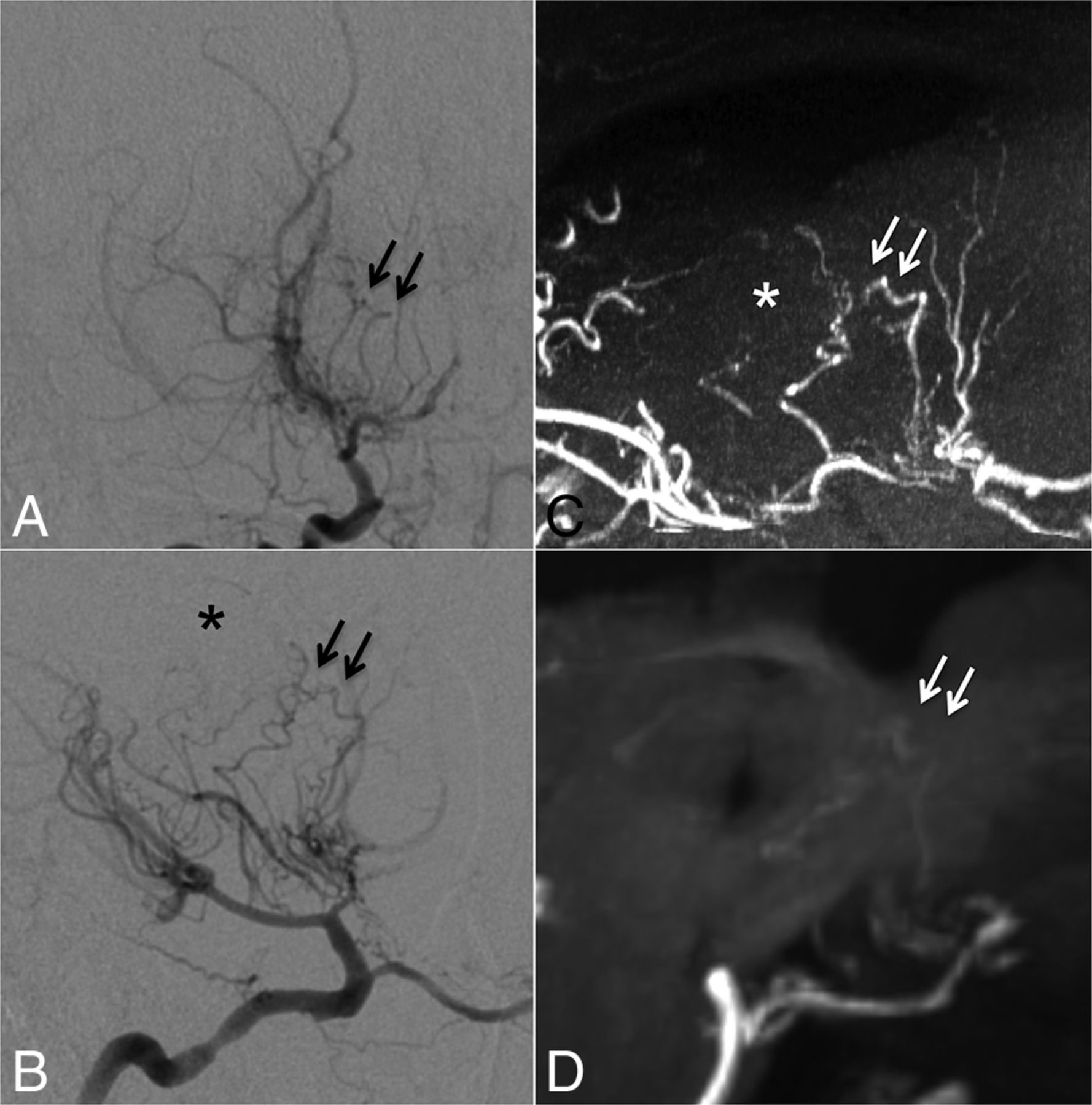 Case 8. Selective right internal carotid angiography (anteroposterior, A; right 45°oblique view, B) shows anastomosis between the posterior communicating artery and the thalamostriate arteries (arrows, type c). MIP from TOF-MRA (C) demonstrates this anastomosis clearly as well as connection with the anterior choroidal artery (asterisk). The latter anastomosis could neither be detected in DSA nor visualized by MIP from MPRAGE (D).