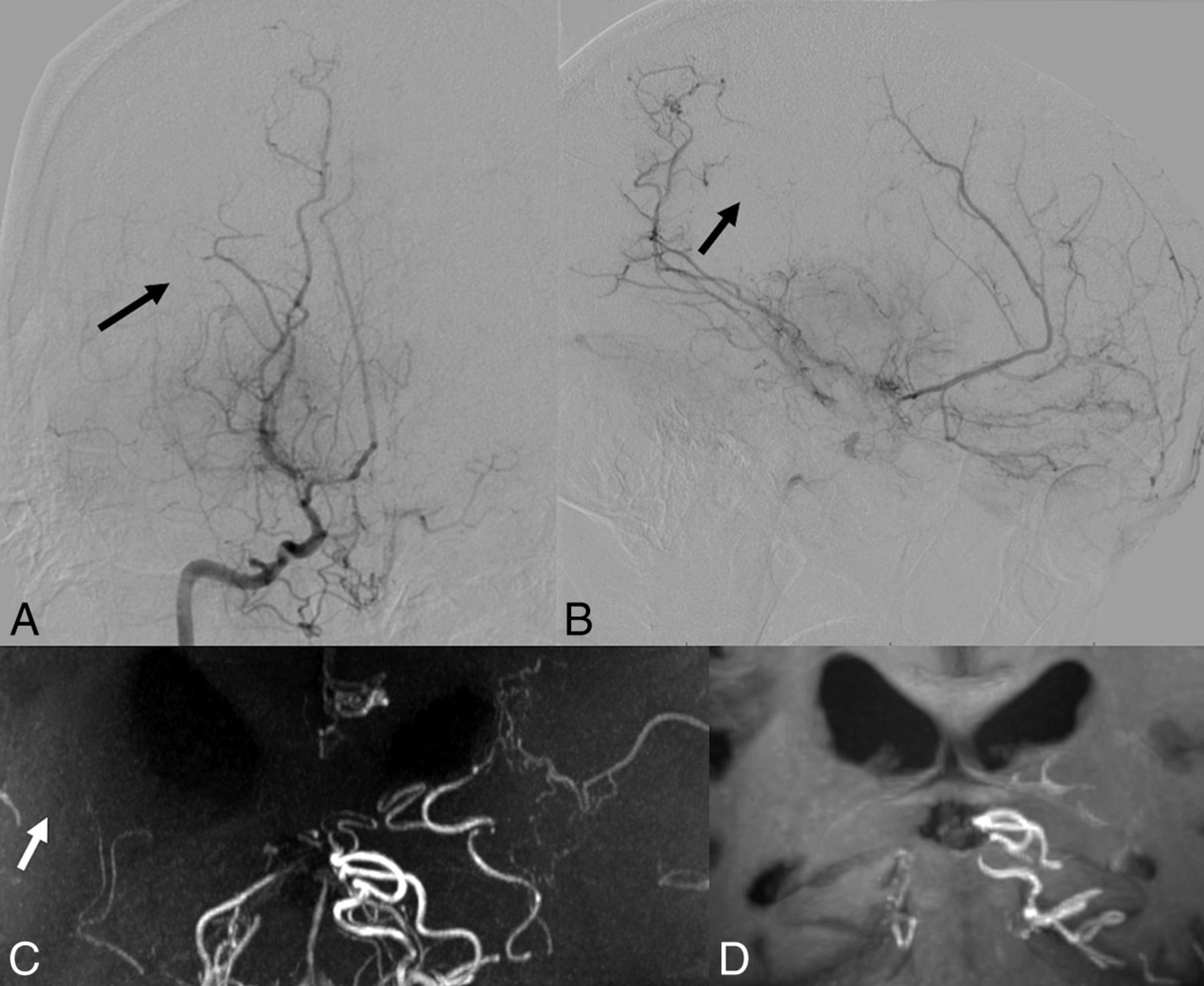 Case 10. Selective right vertebral angiography (anteroposterior, A; lateral view, B) shows a tiny, barely visible anastomosis (black arrows) between the posterior thalamostriate artery and a medullary-cortical artery. MIP from TOF-MRA (C) and MIP from MPRAGE (D) do not delineate the anastomosis. The white arrow (C) indicates the supposed anatomic location of the anastomosis.