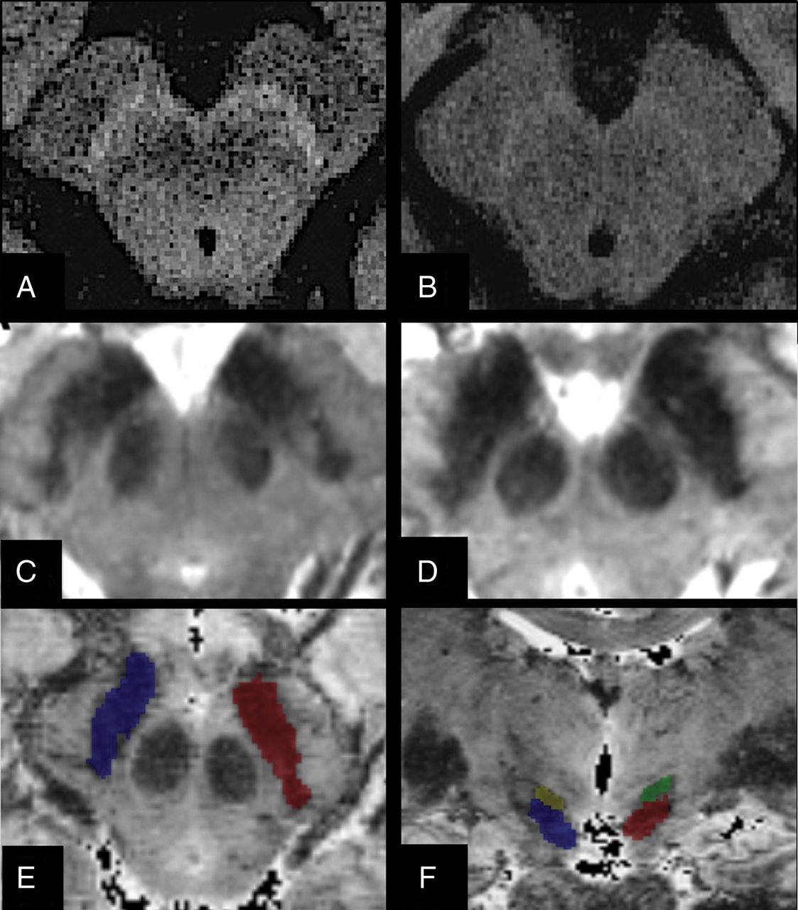 Segmentation of ROIs. Axial brain stem slices in a healthy volunteer (A) and a patient with Parkinson disease (B) show reduction of the neuromelanin signal intensity in the substantia nigra of the patient. Axial T2*WI 7T slices show dorsal nigral hyperintensity in a HV (C), which is absent in the patient with PD (D). T2WI axial (E) and coronal (F) images of the SN in a HV show T2-based segmentation of the SN.