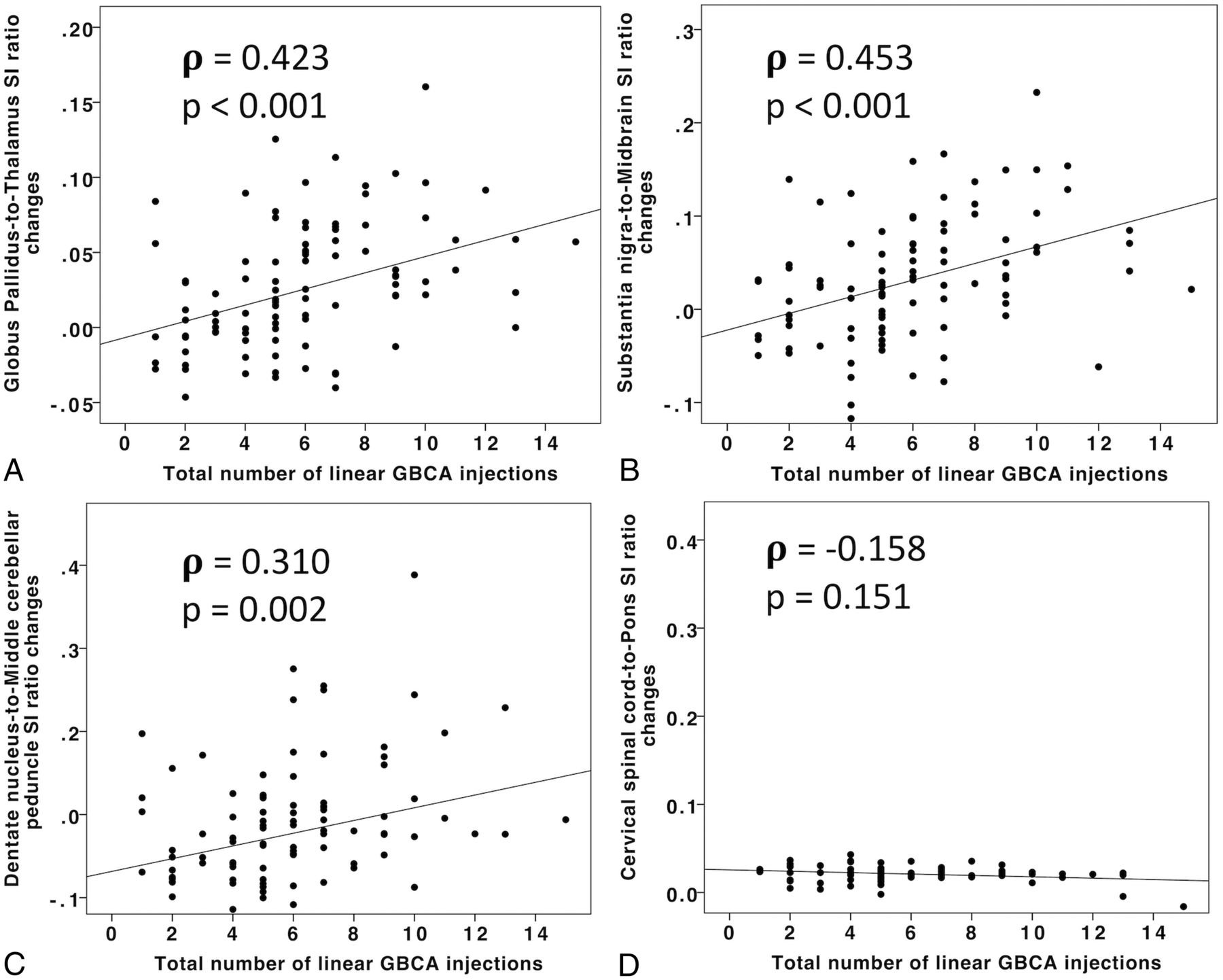 Scatterplots representing the SI ratio changes of the globus pallidus-to-thalamus (A), substantia nigra-to-midbrain (B), dentate nucleus-to-middle cerebellar peduncle (C), and cervical spinal cord-to-pons (D) according to the total number of linear GBCA injections. The Spearman rank correlation coefficient (ρ) and associated P value (P) are reported.