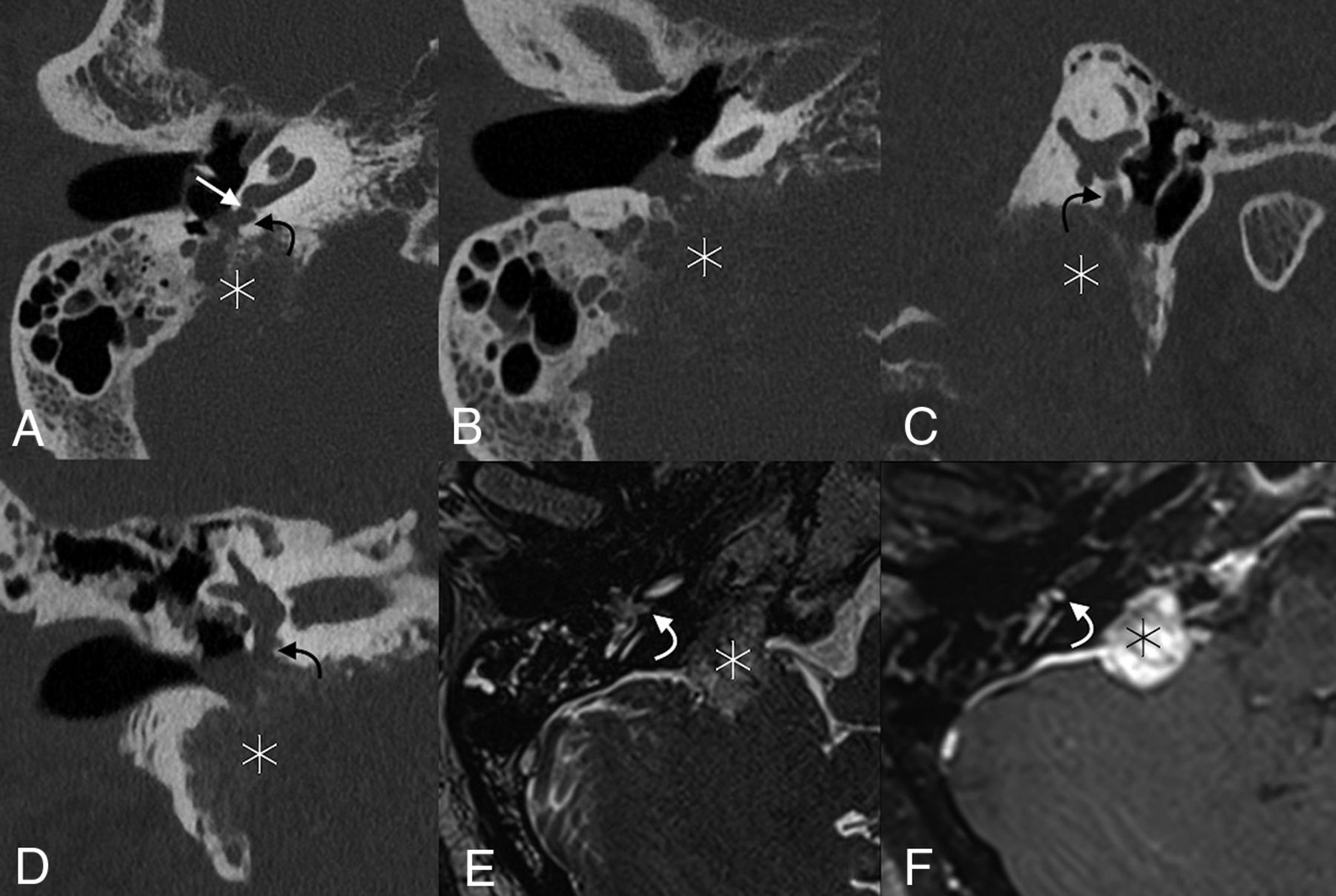 Glomus jugulare tumor with round window obstruction. Axial (A and B), Pöschl (C), and coronal (D) CT images of the right temporal bone show a permeative destructive mass centered in the right jugular foramen (asterisk), which extends into the right middle ear and fills the round window niche (curved arrows); opacification of the niche extends up to the round window membrane (straight arrow). Axial T2 sampling perfection with application-optimized contrasts by using different flip angle evolutions (SPACE sequence; Siemens, Erlangen, Germany) (E) and T1WI with gadolinium (F) also show the mass (asterisk) and round window niche occlusion (curved arrows).