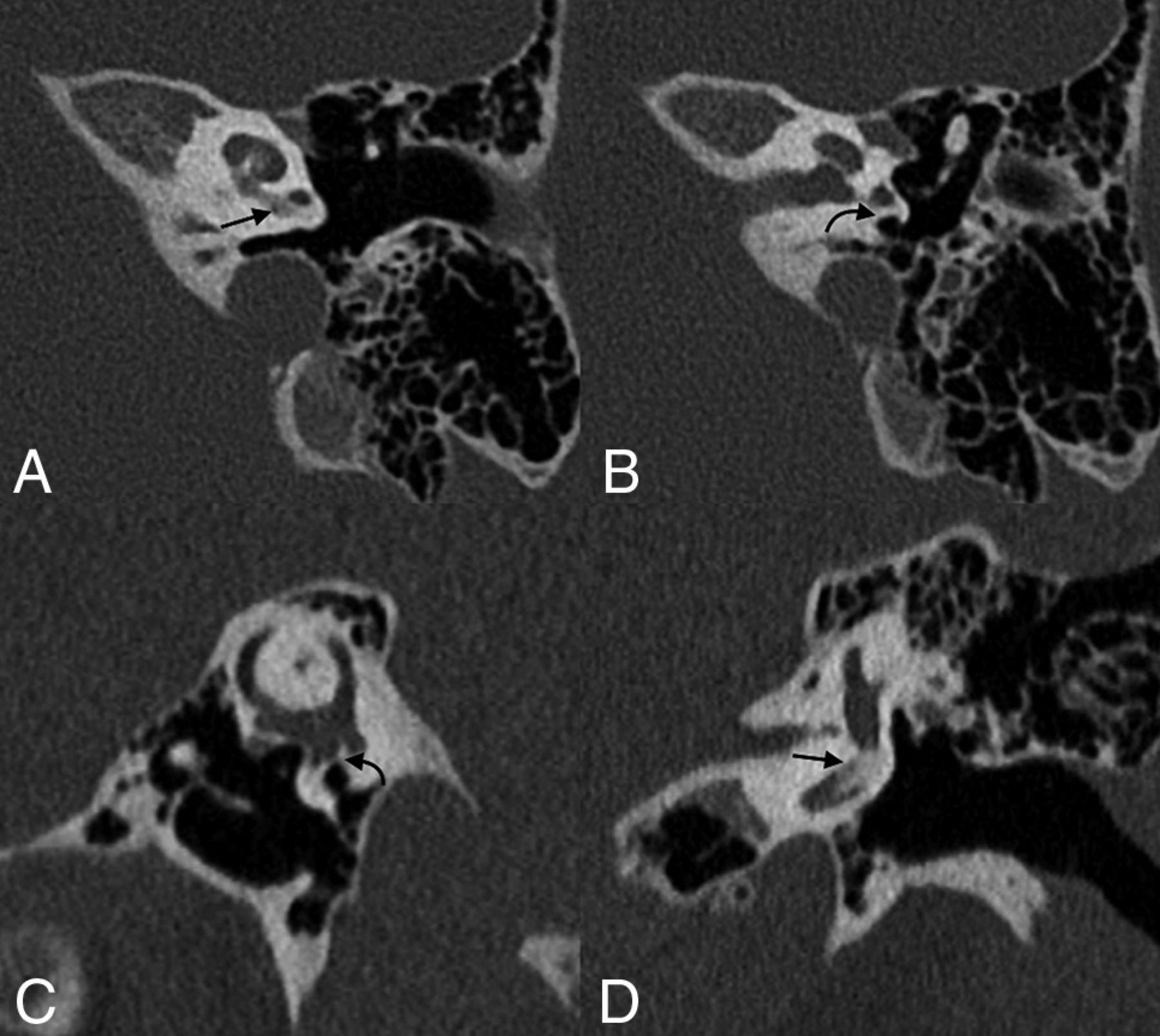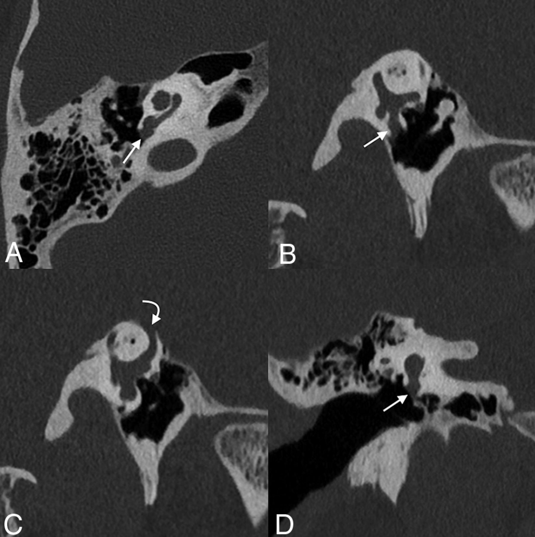 Labyrinthitis ossificans with round window involvement. Axial (A and B), Pöschl (C), and coronal (D) images of the left temporal bone of a 5-year-old with a history of prior tympanoplasty tube placements. Labyrinthitis ossificans is seen in the basal turn of the cochlea (straight arrows, A and D) with mineralization of the round window (curved arrows, B and C).