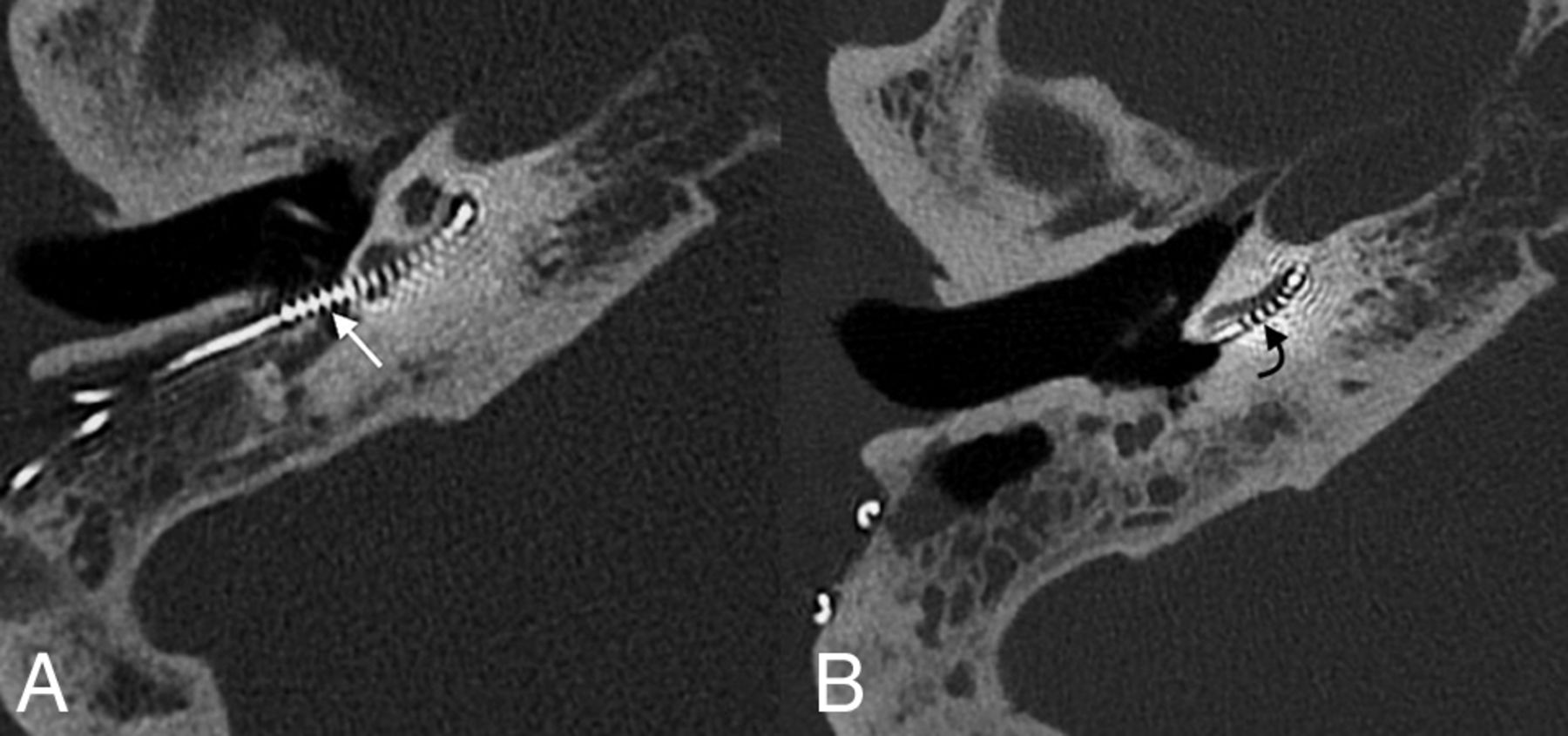 A 64-year-old woman who had poor progress of hearing following the placement of a cochlear implant. Axial CT image at the time of presentation (A) shows that the electrode array is retracted from its expected location, with multiple electrode leads located outside of the cochlea (straight white arrow). Follow-up imaging after surgical revision (B) shows normal positioning of the implant, with the first electrode located approximately 4 mm past the round window (curved black arrow).