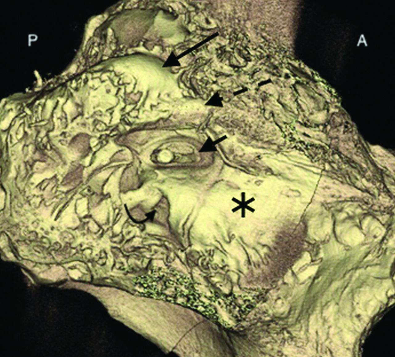 Surface-rendered image of a microCT (GE Healthcare, Milwaukee, Wisconsin) of the temporal bone shows the relationship of the round window niche (curved arrow) to the adjacent anatomic structures. Also seen are the lateral semicircular canal (long straight arrow), facial nerve canal (dashed arrow), stapes and oval window (short arrow), and cochlear promontory (asterisk). A indicates anterior; P, posterior.