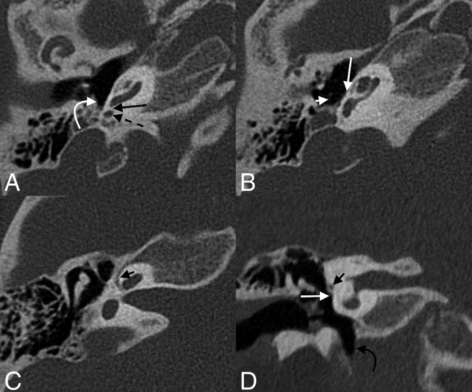 A 5-year-old girl with round window atresia in the setting of CHARGE syndrome. Axial (A–C) and coronal (D) images of the right temporal bone demonstrate complete absence of the round window (long black arrow, A); the round window niche is hypoplastic and surrounded by bone (dashed arrow, A), adjacent to a preserved sinus tympani (curved white arrow, A). Multiple other anomalies are the following: The stapes is dysmorphic with absence of the neck, crura, and footplate (short white arrow, B); the oval window is absent (long white arrow, B and D); the facial nerve canal is diminutive (short black arrow, C) and inferiorly displaced (short black arrow, D); and the hypotympanum is enlarged (curved black arrow, D). The semicircular canals are absent.