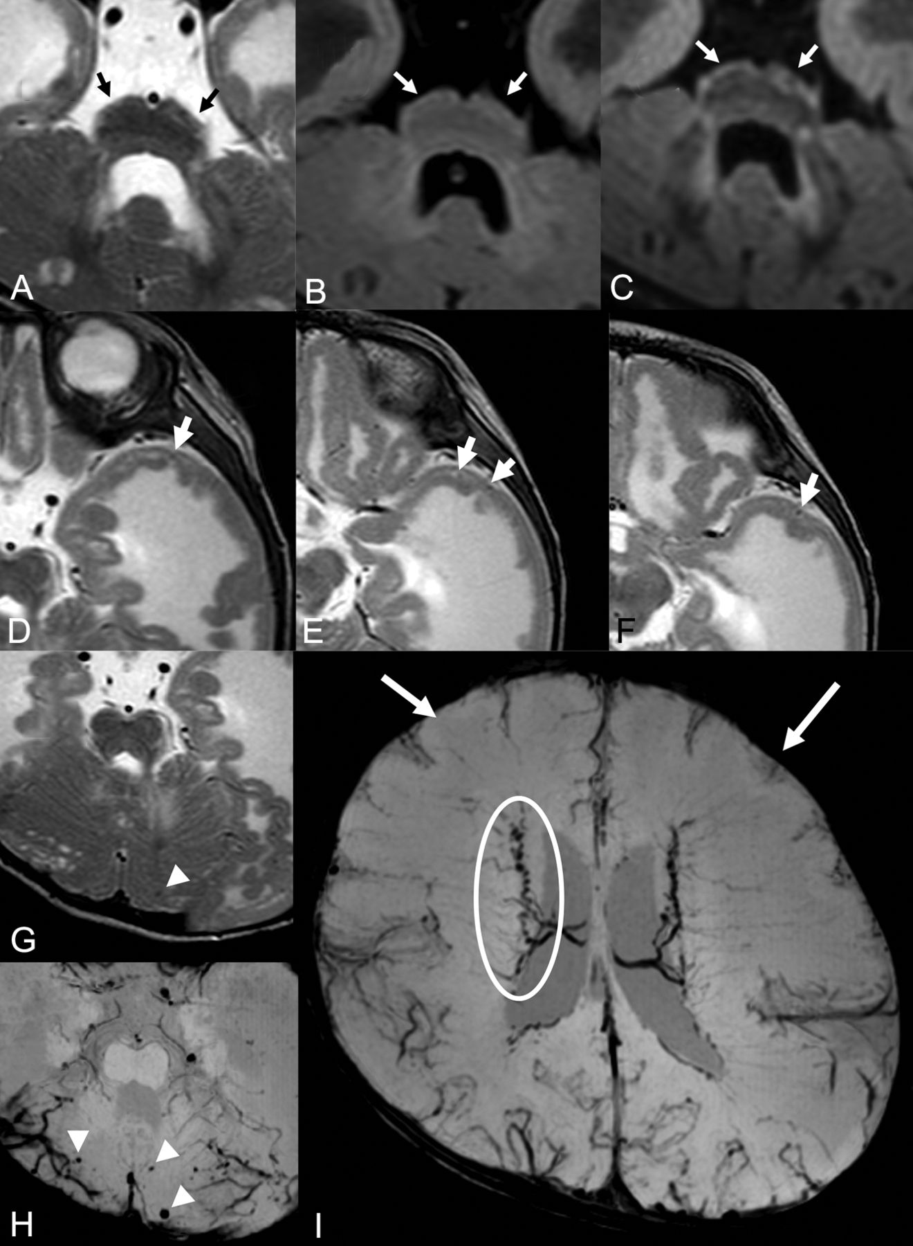 Brain MR imaging of patient 15. Brain stem images on T2WI (A), FLAIR (B), and DIR (C). There is a fluffy structure on T2WI (A, black arrows) and high intensity of the hypoplastic pontine surface on the FLAIR image (B, white arrows). High signal intensity along the brain stem surface on the DIR image is recognized more clearly than on the T2WI or FLAIR image (C, white arrows). T2WIs of the left temporal lobe (D–F) show lissencephalic and the abnormally located cortical superficial vessels running through the superficial layer of the lissencephalic cortex (white arrows). Microhemorrhages were seen in the cerebellar cyst on T2WI (G) and SWI (H). More microhemorrhages are recognizable on the SWI than on T2WI (white arrowheads). Cerebral SWI (I) shows hypoplasia of a superficial cerebral vein in both frontal lobes (white arrows) and dilated and tortuous subependymal veins (white circle).