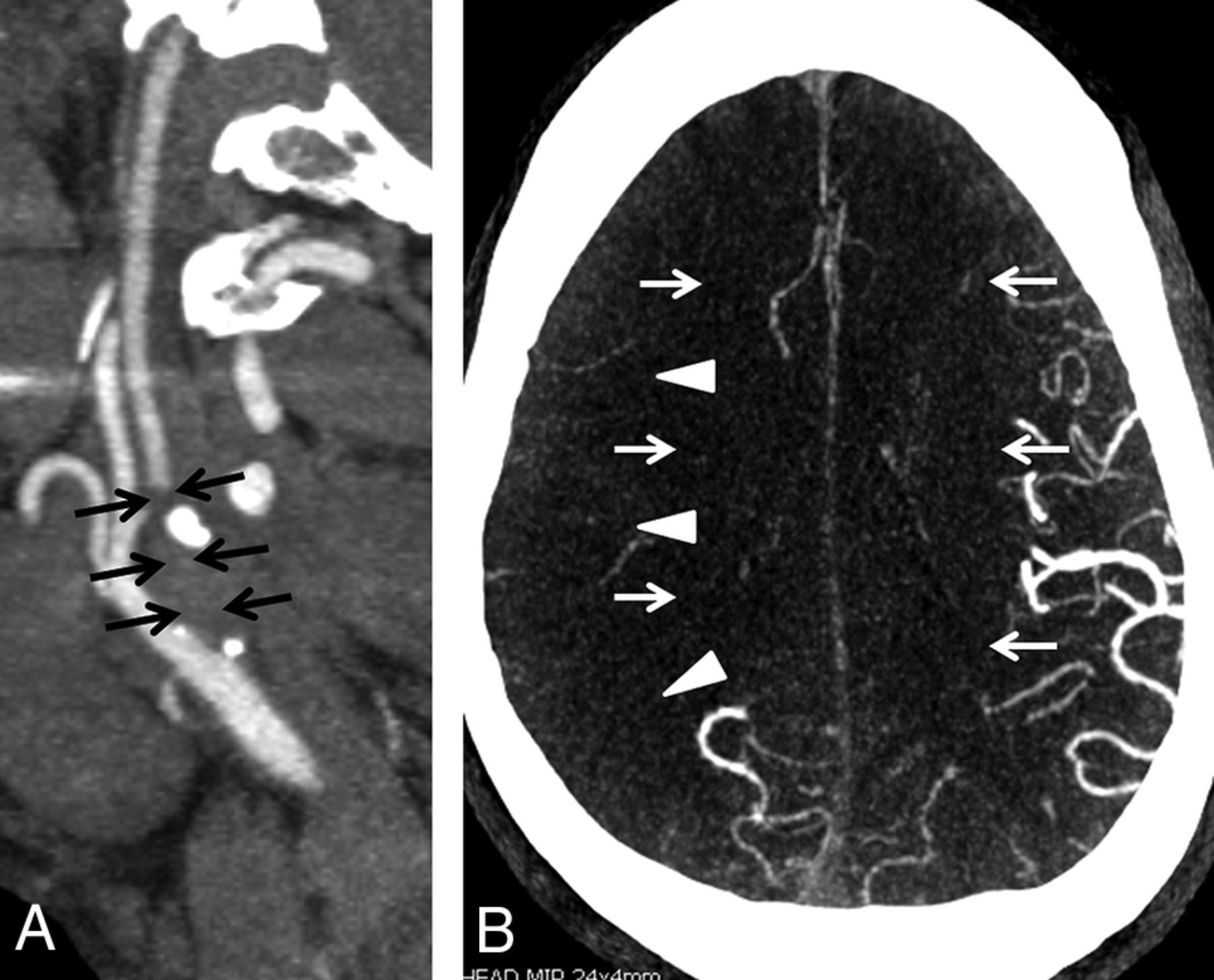 A, Sagittal MIP image from the extracranial CTA performed on the day of admission demonstrates a segmental high-grade stenosis of the proximal right internal carotid artery (arrows). There is normal flow in the right common carotid and external carotid arteries. B, Axial MIP of the intracranial CTA performed on the day of admission demonstrates markedly decreased vascular flow within the branches of the right MCA (arrowheads) and bilateral ACAs (arrows). Conversely, there is normal vascular flow in the left MCA and bilateral posterior cerebral artery territories.