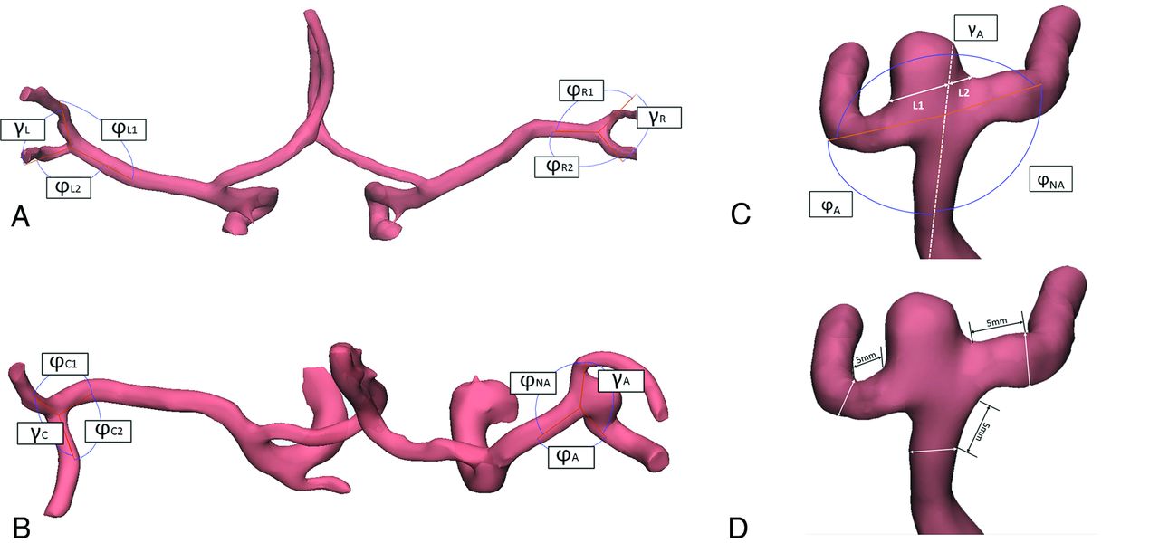 There was no statistically significant difference between groups among the 7 parent-daughter angles (ϕL1, ϕL2, ϕR1, ϕR2, ϕNA, ϕC1, ϕC2; Table 3 and Fig 3A). The daughter-daughter angles (γA and γC) in patients with aneurysms were significantly larger than those (γL and γR) in the control group (Table 3 and vFig 3B).