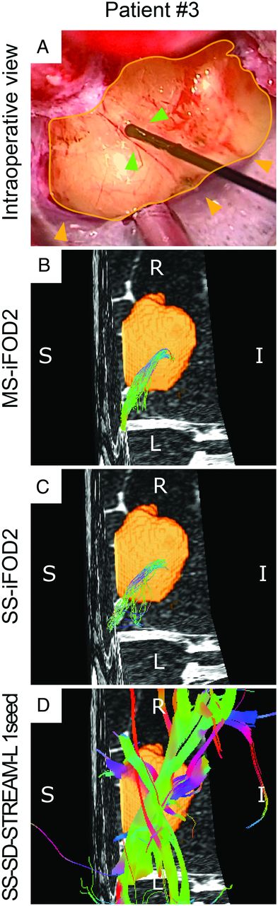 Both MS-iFOD2 (Fig 1B) and SS-iFOD2 (Fig 1C) tracking confirmed the intraoperative course of the FN. Compared with MS-iFOD2, SS-iFOD2 provided an FN reconstruction contaminated by partial volume effect (PVE), incorrectly suggesting an altered and enlarged size of the FN. The SS-SD-STREAM tracking faithfully reconstructed the FN. SS-SD-STREAM-L, used in combination with a single seed, faithfully reconstructed the FN course but affected by PVE and false-positives (Fig 1D). However, when 2 seeds were used, both the PVE and the false-positives tracts were reduced to nil.
