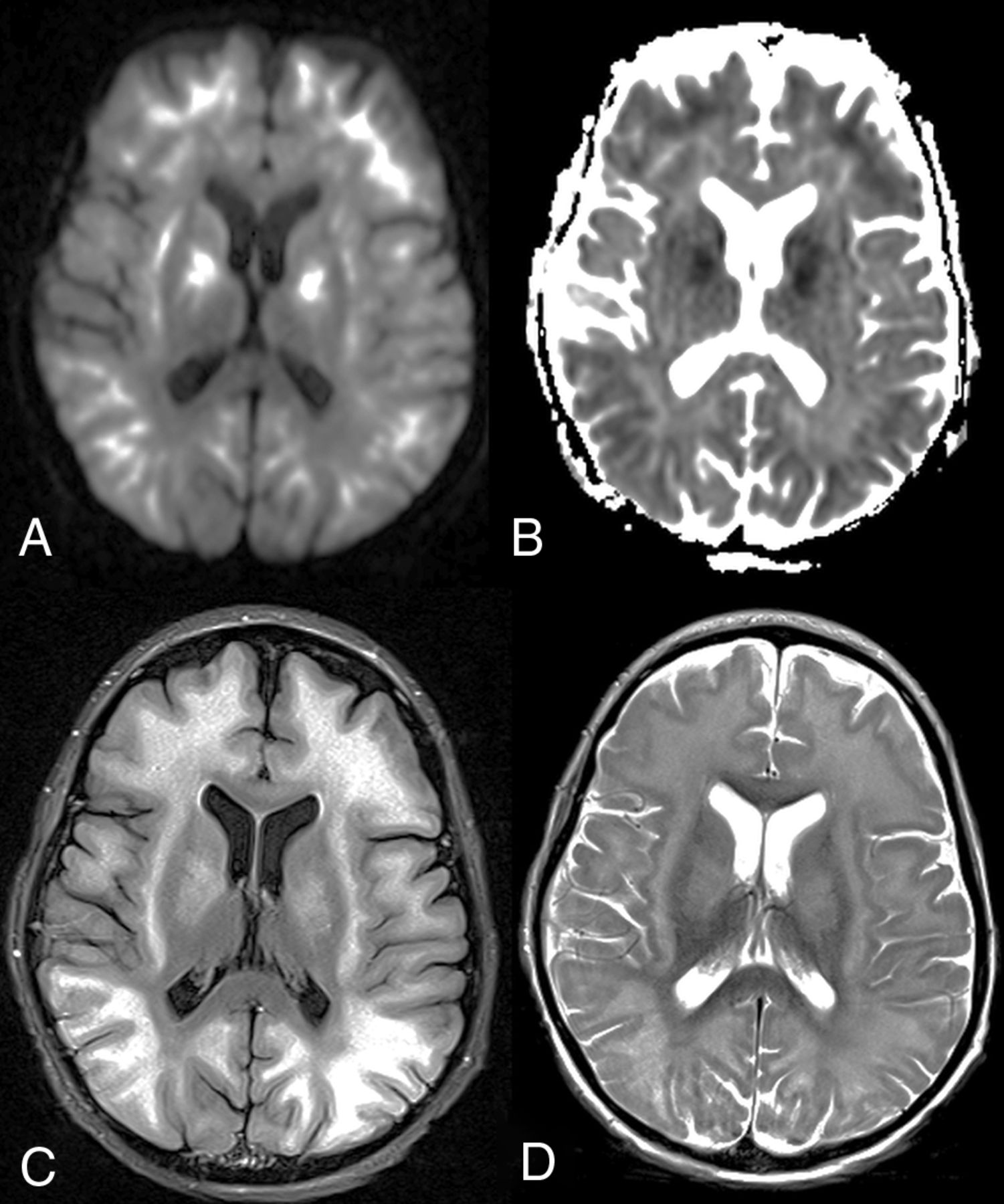 A 10-year-old boy with fludarabine-related PATL (patient 11). Axial DWI (A) and ADC map (B) show symmetric, extensive, and confluent diffusely reduced diffusion with the corresponding hyperintensity on axial FLAIR (C) and T2WI (D) in the subcortical WM and basal ganglia. The child died 7 days after the insult, with the ATL outcome score being 4 (ie, severe outcome).