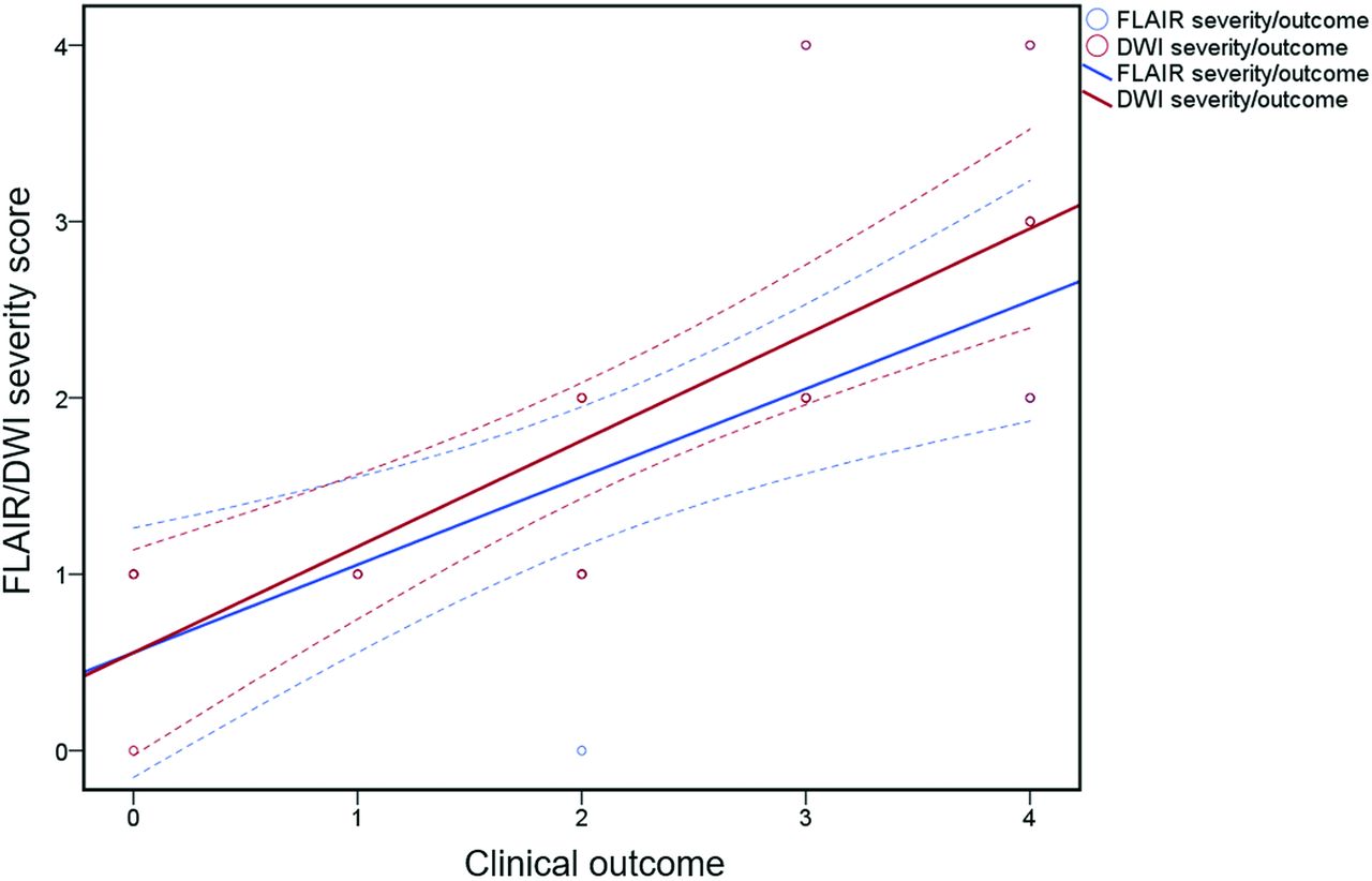 A scatterplot and regression line, which together display the positive relationship between the FLAIR/DWI severity scores and clinical outcome.