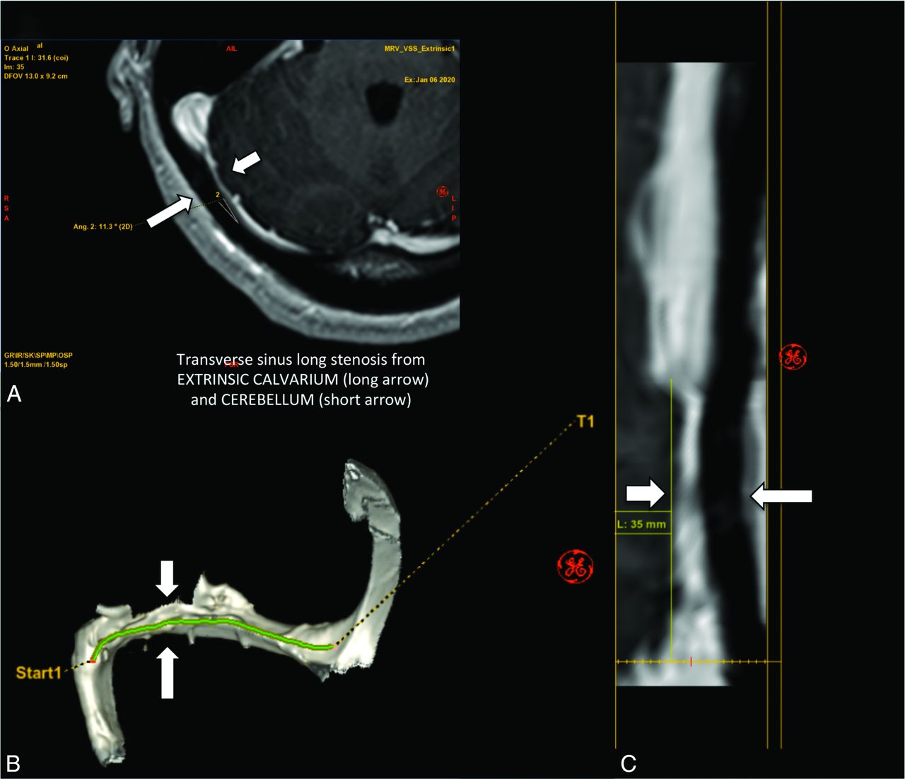 MR images showing extrinsic stenosis of the right transverse sinus. The short arrows point to right cerebellar parenchyma location, and the long arrows points to the occipital calvaria location. A, An axial contrast-enhanced MRV image. B, A 3D reconstruction image. C, A straight-vessel reformat of the right transverse-to-proximal sigmoid sinus from source contrast-enhanced axial images.