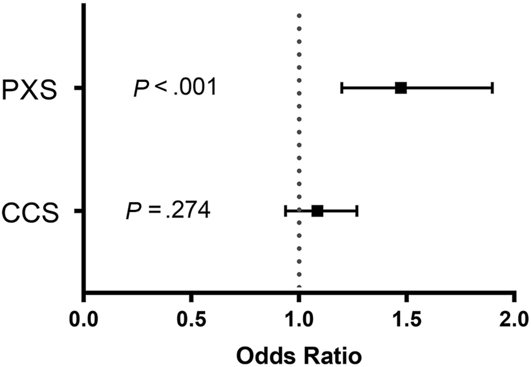Odds ratio of the PXS score and the CCS score in association with the risk of acute neuroimaging findings. A multivariate logistic regression model was used after adjusting for age, sex, the need for intubation, and ICU admission status.
