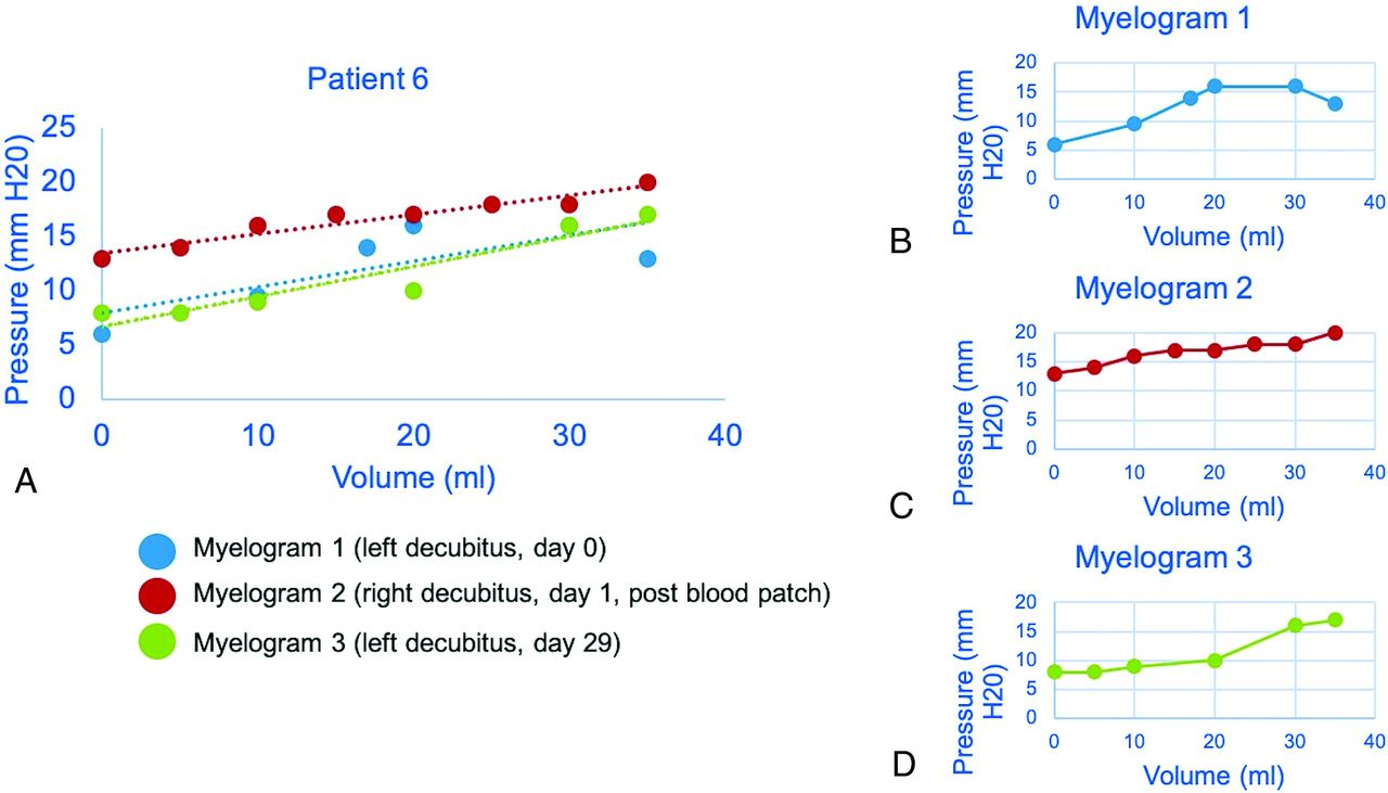 Craniospinal compliance curve in a 63-year-old woman suspected but not radiographically confirmed to have CVF. Estimated linear compliance for each CTM is shown as a dashed line, approximating the shape of the pressure-volume curve (A). The second CTM was performed after the blood patch showed an increase in opening pressure (B and C). The effect of the blood patch is diminished on delayed repeat CTM (D), in which the left side of the curve, including opening pressure, more closely matches the prepatch curve.