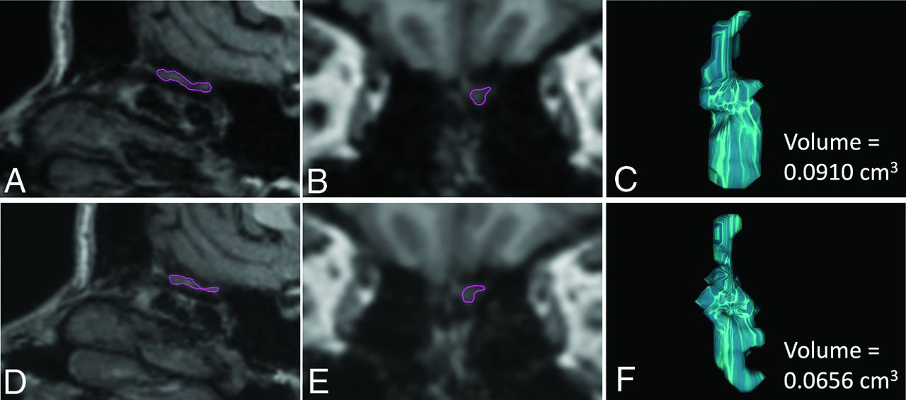Illustration of the volumetric measurements of the left OB in a C19+ participant, in whom a decrease in OB volumes was observed 11 months after infection compared with the premeasure. The upper panel shows sagittal (A) and coronal (B) reconstructions of the high-resolution 3D T1WI sequence from the premeasure MR imaging with the left OB delineated in purple and the resulting computed OB volume (C). The corresponding data are shown for the postmeasure in the lower panel (D–F).