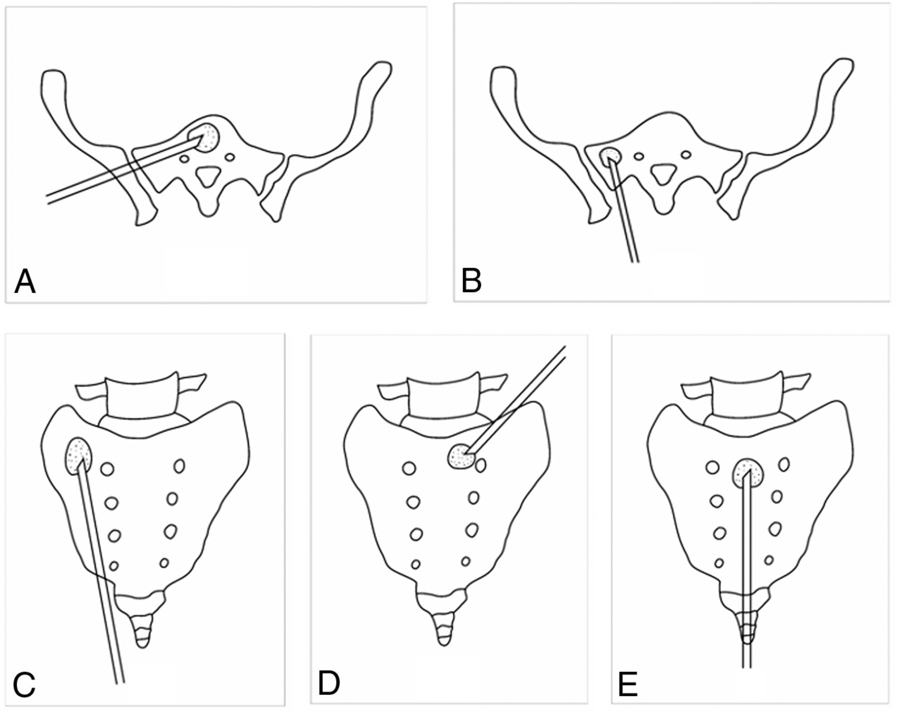 Three doctors, all with >15 years of extensive experience in musculoskeletal intervention, performed PSP/RFA. The patient was placed on the operating table in the prone position. All procedures were performed with the patient under local anesthesia (2% lidocaine) and conscious sedation. Strict aseptic techniques were followed. The approach chosen (posterior, anterior-oblique, interpedicular, and transiliac) depended on the location of the lesion, with the aim being to reach the targeted lesion via the shortest distance without causing vessel or nerve damage (Figs 1 and 2). Generally, the anterior-oblique, transiliac, or posterior approaches were selected for lesions in the sacral ala, while the posterior approach was selected for lesions in other parts of the sacrum; the interpedicular approach was used for metastases in the sacral bodies.