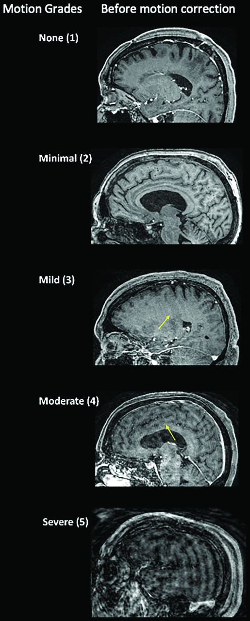 Two neuroradiologists (M.L. and J.F. with 3 and 5 years of experience, respectively) performed independent blinded reviews of unlabeled MPRAGE images without and with SAMER motion correction. The order of the study and the type of study (baseline-versus-SAMER motion-corrected images) were randomized by A.T. for the reviewing neuroradiologists. Cases with any discrepant grades were adjudicated independently by a third blinded senior neuroradiologist (J.C.) with >10 years of experience. A previously established 5-point motion scale was used for grading (Fig 1).1 Grade 1 indicates the absence of detectable motion artifacts; grade 2 indicates minimal motion with barely detectable motion artifacts and a negligible effect on image quality and diagnosis; grade 3 indicates mild motion with noticeable motion artifacts that likely do not have diagnostic consequences; grade 4 indicates moderate motion artifacts that degrade and possibly obscure underlying pathology; and grade 5 indicates severe motion artifacts that distort anatomy and obscure underlying pathology. Grades 1, 2, and 3 were considered diagnostic quality with regard to motion artifacts, whereas grades 4 and 5 were considered nondiagnostic, as defined in the original article by Andre et al.1 The motion grade improvement was defined as the precorrection motion grade minus the postcorrection grade.