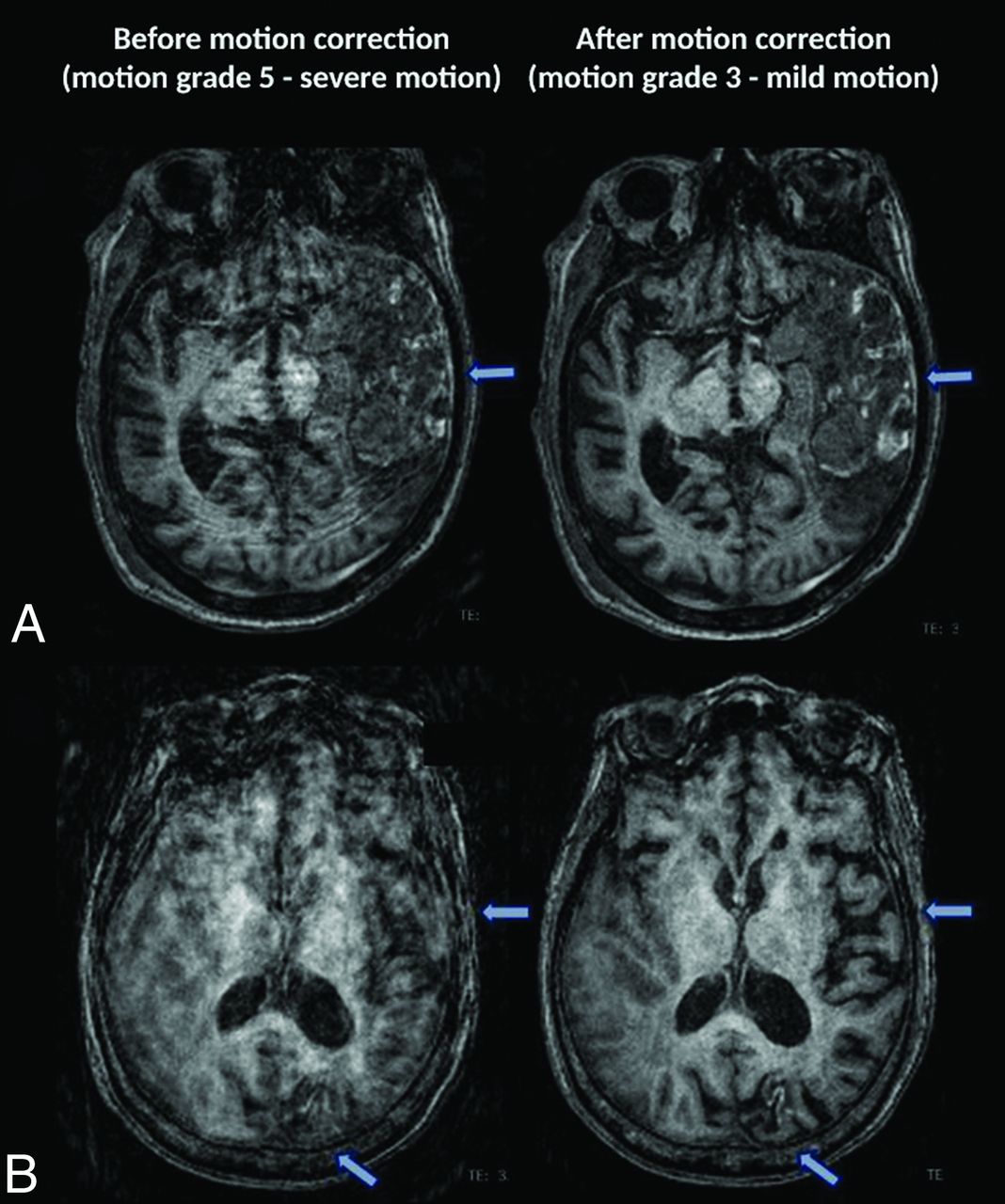 RESULTS: The median SAMER reconstruction time was 1 minute 47 seconds. SAMER motion correction significantly improved overall motion grades across all examinations (P < .005). Motion artifacts were reduced in 28% of cases, unchanged in 64% of cases, and increased in 8% of cases. SAMER improved motion grades in 100% of moderate motion cases and 75% of severe motion cases. Sixty-nine percent of nondiagnostic motion cases (grades 4 and 5) were considered diagnostic after SAMER motion correction. For cases with minimal or no motion, SAMER had negligible impact on the overall motion grade. For cases with mild, moderate, and severe motion, SAMER improved the motion grade by an average of 0.3 (SD, 0.5), 1.1 (SD, 0.3), and 1.1 (SD, 0.8) grades, respectively.