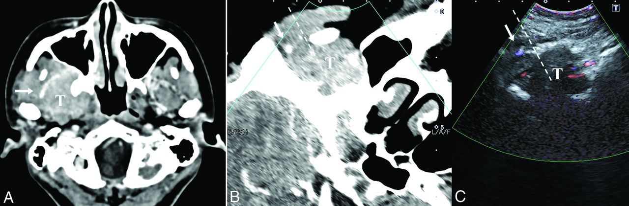 A 30-year-old woman with maxillofacial swelling, pain and dizziness for 2 years (patient No. 3). A, The axial contrast-enhanced CT image shows a homogeneously enhancing lesion involving the infratemporal fossa and pterygopalatine fossa. A branch of the maxillary artery runs superficially around the lesion (arrow). After a successful fusion of CT (B) and US (C), we can locate the target lesion that is occult on US due to the acoustic shadow of the mandible. Color Doppler US helps to avoid the maxillary artery (arrow). The dashed line indicates the expected needle path via the subzygomatic approach. Histopathology demonstrated meningioma (meningothelial subtype, World Health Organization grade I). T indicates target lesion.