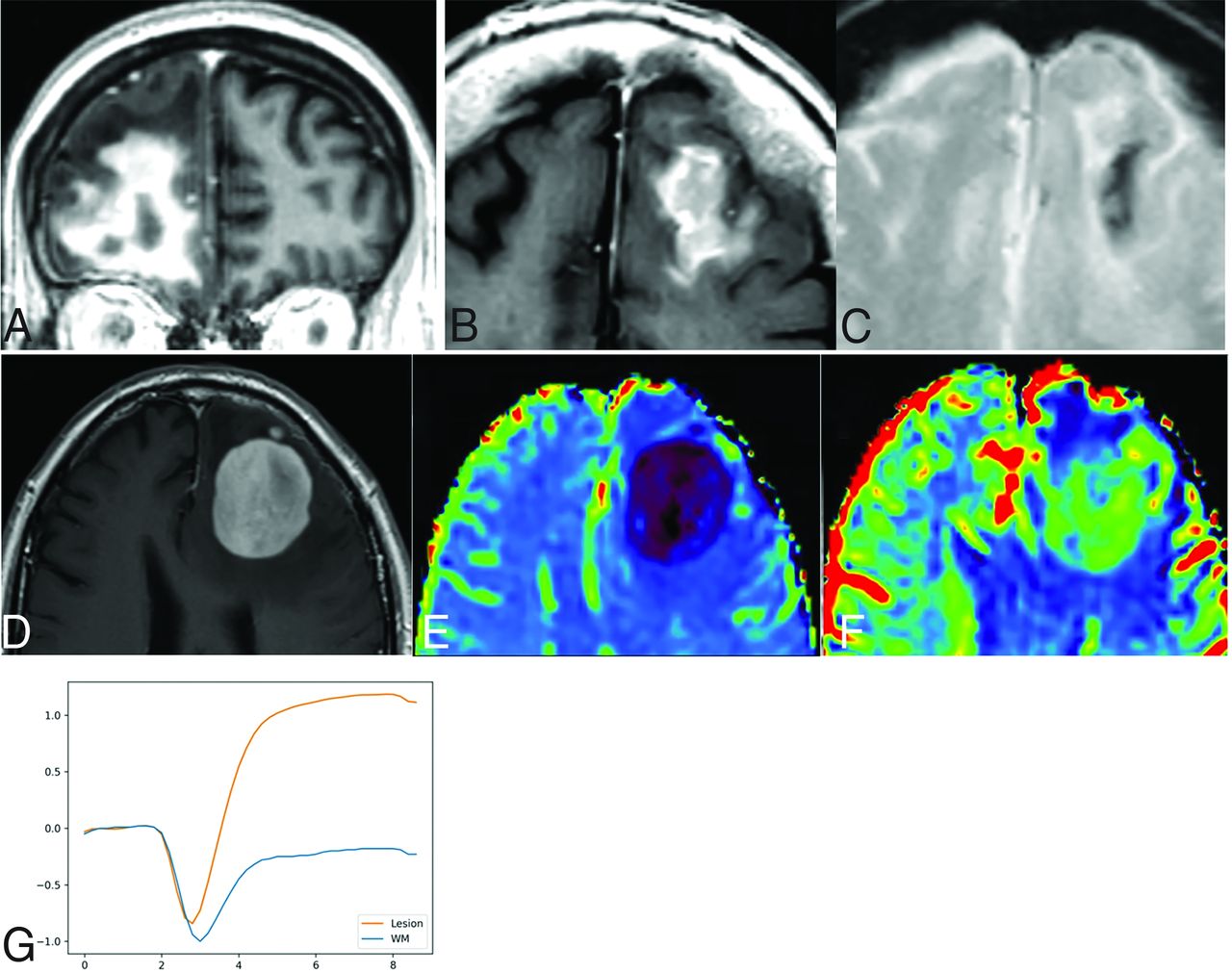 A–C: Primary DLBCLs of the CNS, EBV-negative, with imaging signs of central necrosis (A) and tumoral hemorrhage (B and C). D–G: DSC-PWI features of a left frontal primary DLBCL of the CNS, EBV-negative (D). Low-to-intermediate CBV on noncorrected (E) and corrected (F) color maps. Characteristic lymphoma DSC-PWI time-intensity curve morphology with ascending-part of the curve recovering signal intensity far above the baseline (high PSR) (G).
