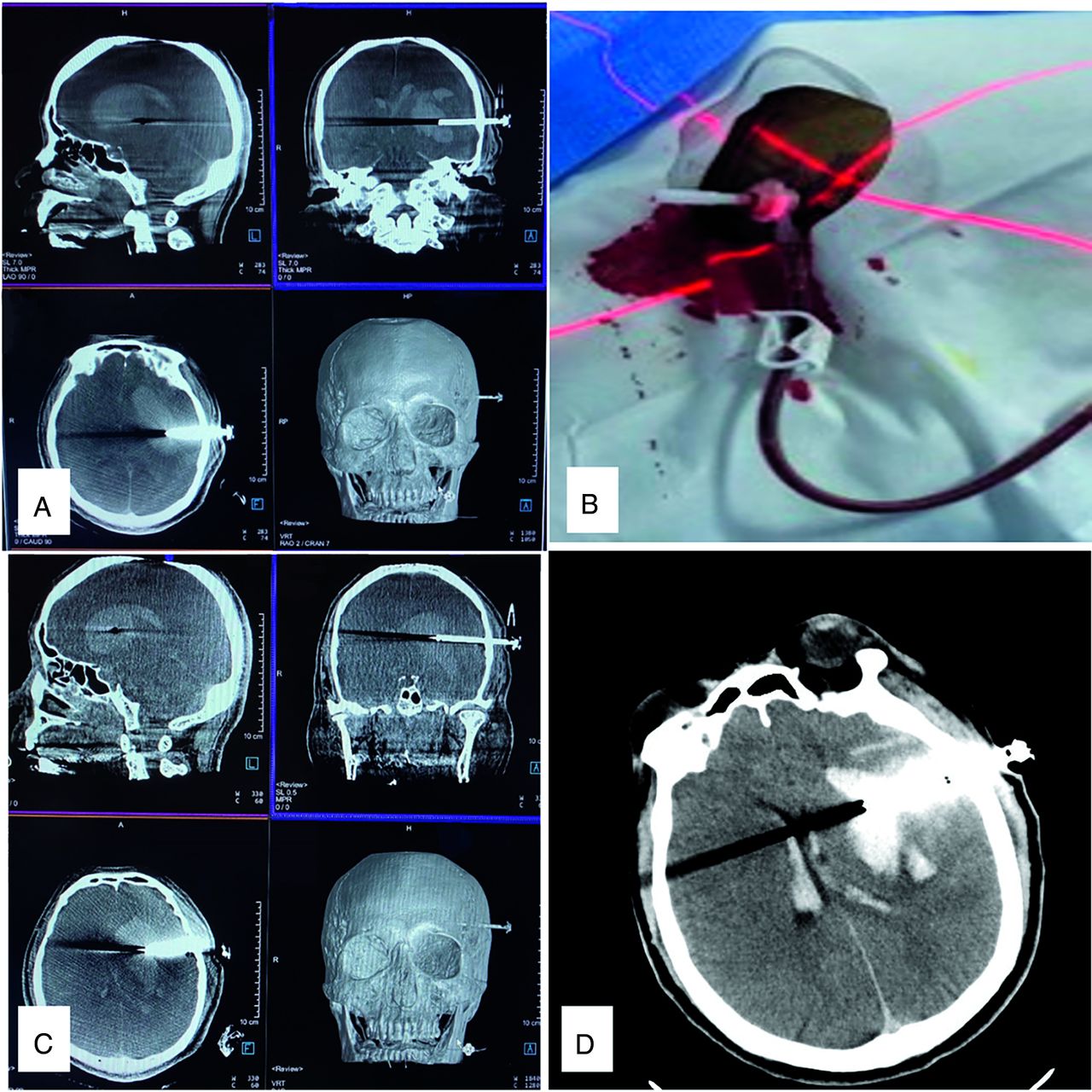 Minimally invasive craniopuncture was performed using a YL-1 Needle (Beijing WanTeFu Medical Apparatus). The YL-1 needle, with a diameter of 3 mm, is an internal drilling needle that is enclosed by a casing with small holes at the end to facilitate fluid flow. Initially, an electric drill is used in conjunction with the YL-1 needle for puncturing purposes. The first FDCT scan is performed when the puncture needle is fixed to the skull and the dura is not punctured. According to the results of FDCT, the direction of puncture is adjusted and the dural puncture is continued. To reach the center of the hematoma, we removed the assembly comprising the internal drill needle. To minimize potential brain damage risks, we used plastic needles as substitutes for internal drilling needles. These plastic needles have a blunt end and are 2 mm longer than their internal drill counterparts. The puncture needle is drilled through the skull and into the hematoma before the cannula is fixed to the skull and the hematoma is aspirated. A 20-second DynaCT scan (Siemens) was performed as necessary to monitor the degree of aspiration.