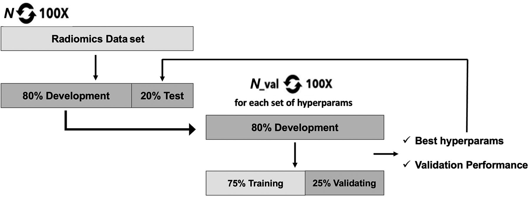 We used random forests (RF) as the classification algorithm.28 Previously, Wagner et al29 demonstrated that RF perform best with limited data sets compared with other ML algorithms, including XGBoost (https://xgboost.readthedocs.io/en/stable/), and neural network architectures. The hyperparameter grid space was defined according to the Online Supplemental Data. We conducted 100 experiments and used an AUC to evaluate the classifiers. We randomly split our data into test (20%, 50 patients) and development (dev, 80%, 202 patients) sets in each iteration in a loop with N repetitions. Subsequently, a filtration algorithm was trained on the dev set and applied to the test set to eliminate highly correlated features (correlation coefficient >0.95). To measure the validation performance, models with the best hyperparameter set were trained and validated 100 times (N_val) on random dev data splits with a 75/25 ratio. Finally, an instance of the model with the best hyperparameters was trained on the entire dev set and evaluated on the test cohort. The whole process was repeated 100 times (N); thus, we have 100 test AUCs. The final evaluation of the model was conducted on the unseen test cohort.