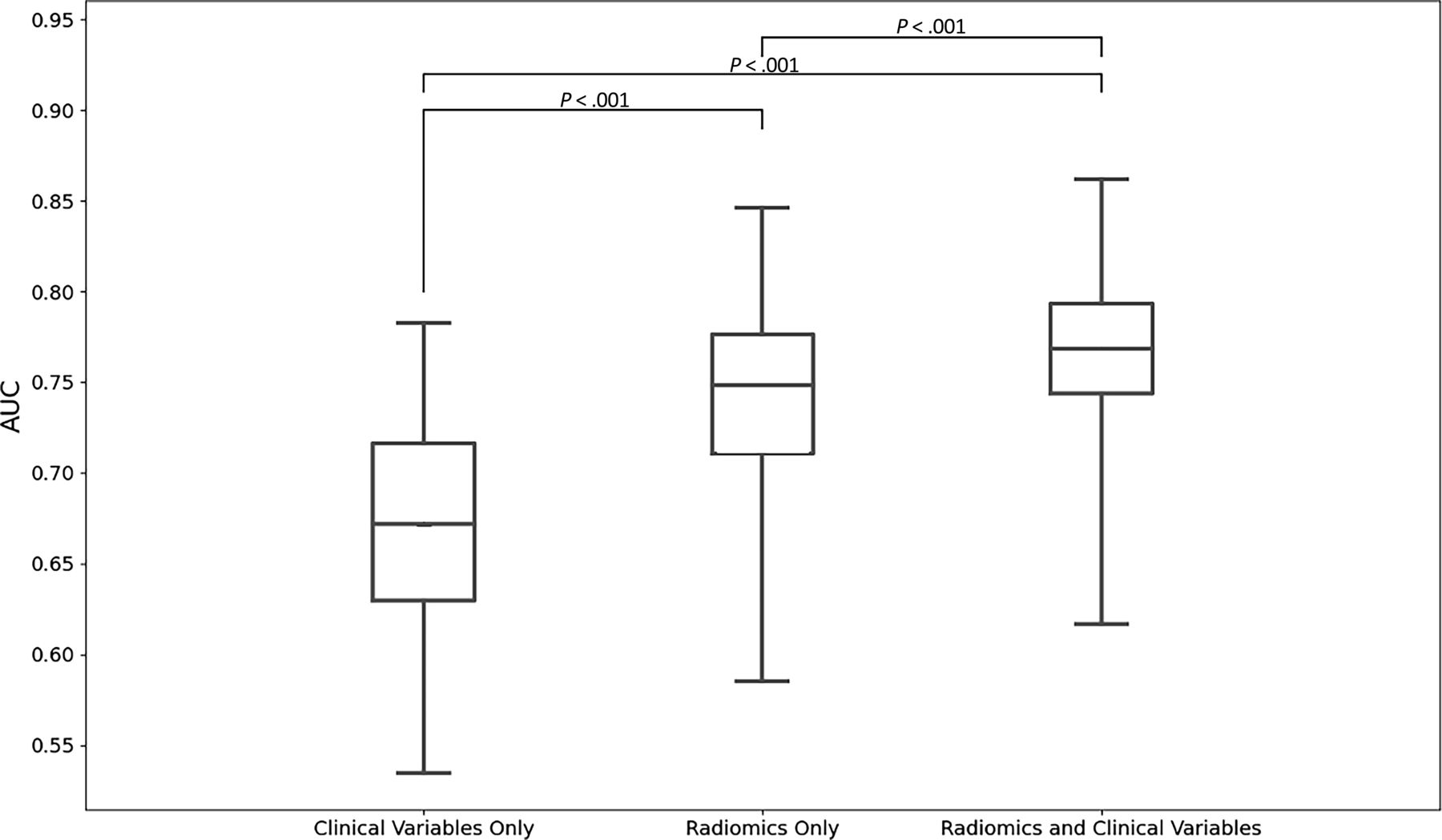 Boxplots of test AUCs. Note that P values are calculated on the basis of Student t tests.