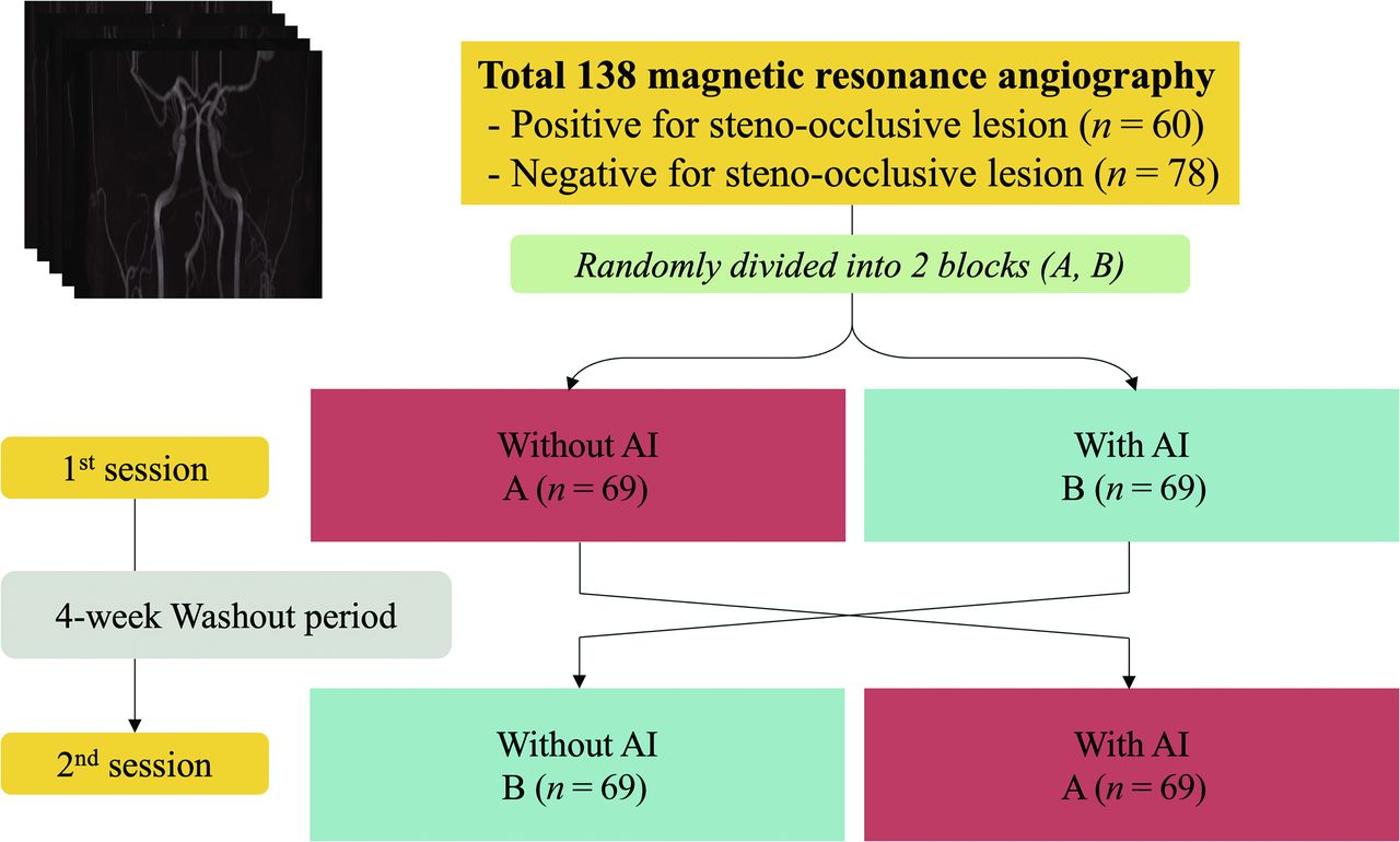 Five radiologists, including 2 neuroradiologists (S.H.B. and S.J.C., with 10 and 9 years of experience in neuroradiology, respectively) and 3 radiology residents (J.H.J., H.S.C., and H.U.C., with 4, 3, and 3 years of clinical experience, respectively), participated as observers. The radiologists who determined the reference standard did not participate. Each reviewer conducted 2 separate assessments of all TOF-MRA studies (n = 138) across 2 sessions. The studies were randomly divided into 2 blocks (Block A and Block B, each containing 69 studies). During the first session, studies in Block A were reviewed with AI assistance, and those in Block B were reviewed without AI. To mitigate bias and memory recall effects, a compulsory 4-week washout period was placed between the sessions. After this interval, the review conditions were swapped: During the second session, studies initially reviewed with AI (Block A) were assessed without AI, and vice versa for Block B (Fig 2). The reviewers were blinded to the patient information and reference standards. They were instructed to assess whether there is stenosis or occlusion in the intracranial artery by using a commercial PACS. Upon conducting an AI-assisted review, the heat map generated by the AI model was superimposed onto the MIP TOF-MRA images. The heat map images were reviewed using an additional viewer (Windows Photo Viewer, Microsoft). The participants were instructed to mark a stenotic or occlusive lesion by recording the coordinates of the central portion of the lesion. The confidence rating for each lesion ranged from 1 (very uncertain) to 5 (absolutely certain). The overall reading time was recorded for each case. During the review, they were encouraged to evaluate both the source and MIP TOF-MRA images.