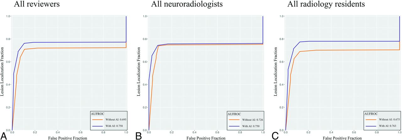 Pooled JAFROC curves of all reviewers (A), neuroradiologists (B), and radiology residents (C). With AI, the AUFROC for all reviewers improved considerably from 0.70 to 0.76 (P = .027). Similarly, the use of AI improved AUFROC for radiology residents from 0.68 to 0.76 (P = .002). The AUFROC for neuroradiologists did not show statistical difference between the results without and with AI.