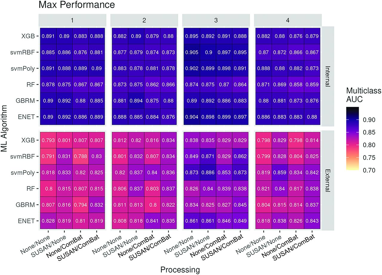 RESULTS: Most top-performing models on the external test set used BIP+SUSAN denoising–derived features. Overall, the use of SUSAN denoising and Combining Batches harmonization led to a slight but generally consistent improvement in model performance on the external test set.