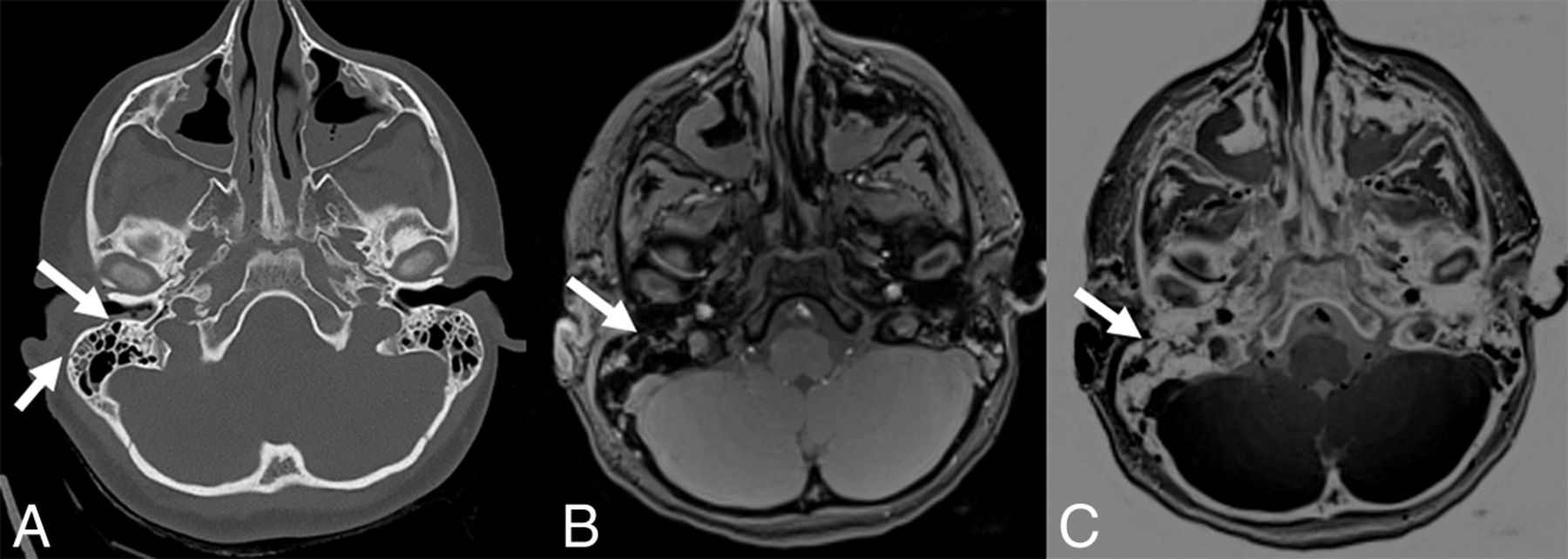 A, Axial CT image shows 2 small nondisplaced linear fractures of the mastoid (arrows). On black bone (B) and inverted black bone (C) MR images, these fractures are barely visible (arrows).