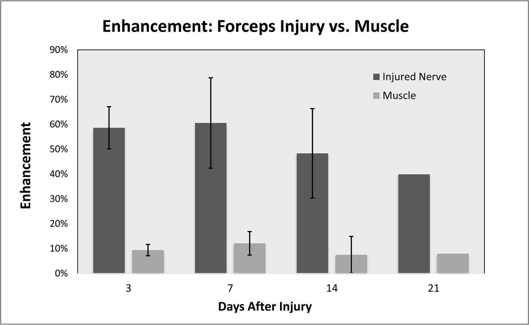 RESULTS: Forceps crush injury caused robust enhancement between days 3 and 21, while clip crush injury resulted in minimal-to-no enhancement. Enhancement after forceps injury peaked at 7 days and was seen a few millimeters proximal to, in the region of, and several centimeters distal to the site of crush injury. Enhancement after forceps injury was statistically significant compared with clip injury between days 3 and 7 (P < .04).