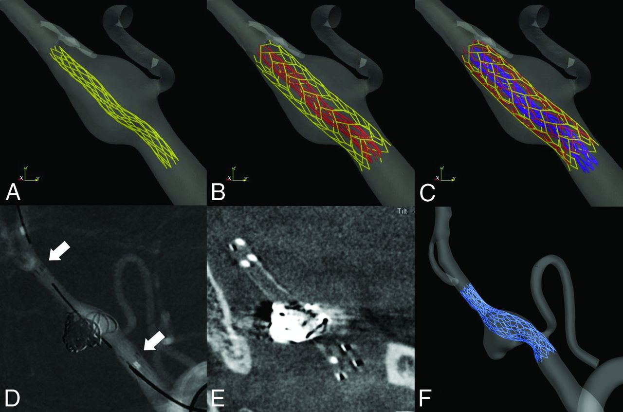 Process of virtual stent deployment. A–C, Three virtual Enterprise stents were deployed one by one. D and E, Location of real stents in 2D angiography and DynaCT (Siemens). F, Virtual stents deployed in a similar location with the real counterparts.