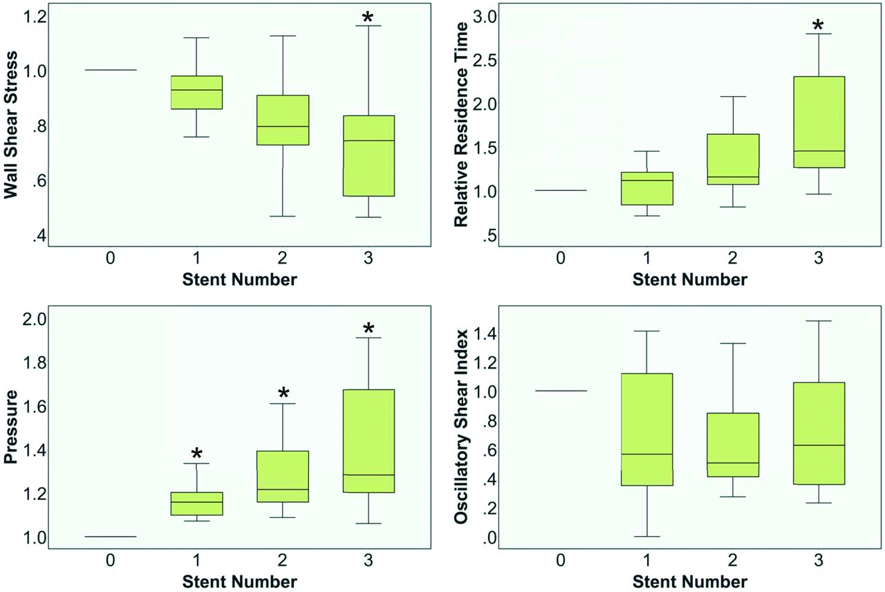 Statistical analyses were performed by using Excel 2003 (Microsoft, Redmond, Washington) and SAS 9.1 (SAS Institute, Cary, North Carolina). Hemodynamic parameters were normalized by the prestenting status values in each case to investigate the rate of variation caused by different stent placement strategies. Then the Kruskal-Wallis H test was used, followed by the Nemenyi test for multiple comparisons. P < .05 (2-sided) was the criterion for statistical significance.