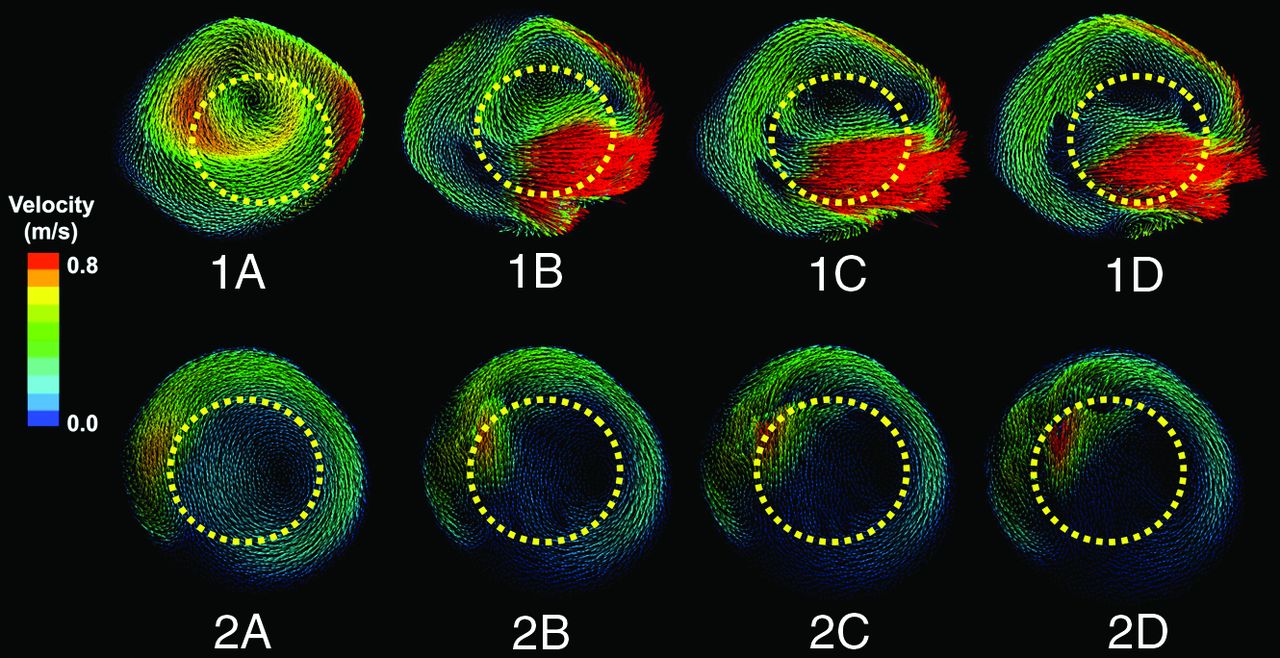 Changes of the flow patterns before and after stent implantation were observed by plotting the speed vector field. The results showed that the flow patterns were not significantly changed after stent implantation. However, the intensities of the vortices were reduced, and the number of vortices in some cases was decreased (Fig 3).