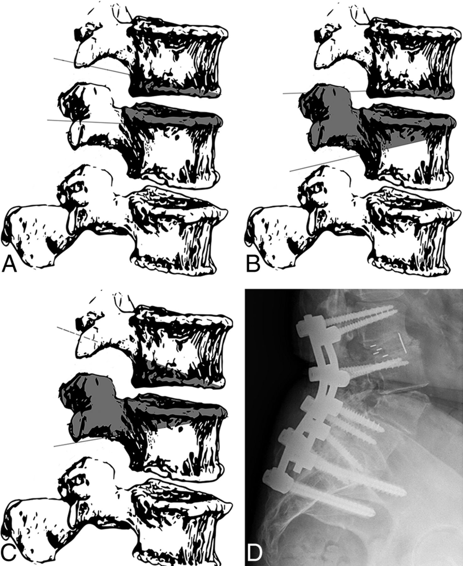 A, BDBO type 1. This osteotomy involves the resection of the inferior portion of the target vertebra, along with the disc and superior endplate below it. B, BDBO type 2, also known as extended PSO. This osteotomy extends PSO cranially to involve the disc and inferior endplate of the vertebra above it. C, BDBO type 3. Closing wedge osteotomies are performed at levels both above and below the targeted disc level, with the osteotomy extending to just inferior to the transverse processes of the both levels. D, Lateral view plain radiograph demonstrates an extended PSO (BDBO type 2) at L4 where the PSO extends into the posterior two-thirds of the superior endplate.