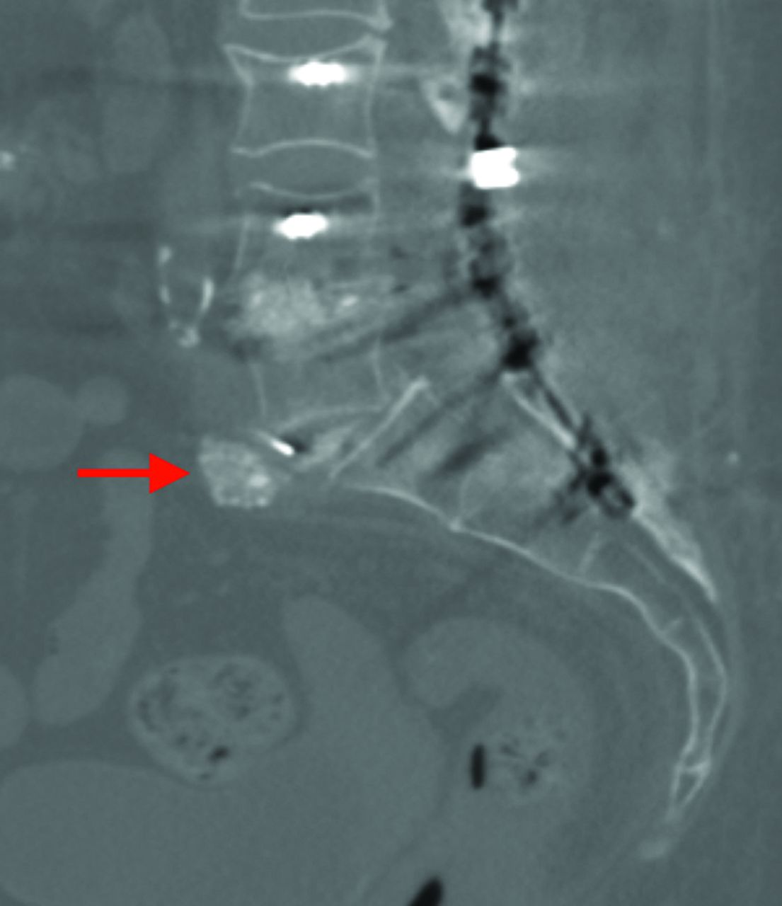 A patient with prior fusion instrumentation from L2 to the sacrum who underwent 2-level transforaminal lumbar intervertebral fusion at L3–L4 and L4–L5. There was inadvertent intraoperative anterior longitudinal ligament disruption at L5–S1. This essentially resulted in an anterior opening osteotomy effect along with a Smith-Petersen osteotomy posterior closing osteotomy (ie, X-osteotomy). There is an unintentional anteriorly extruded intervertebral disc graft at this level (arrow).