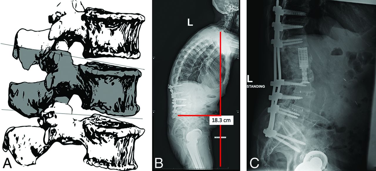 On imaging, PSO may be mistaken for a posterior wedge compression fracture if one is not aware of this type of surgery. PSO is generally indicated for correction of SVAs of >10–12 cm, and it can provide 30°–40° of lordosis correction on average.31,32 In this technique, along with pedicle screw posterior fixation, wide laminectomies are performed at adjacent levels to protect the exiting nerve roots. Interbody fusion at levels above and below the osteotomy may be performed to avoid pseudoarthrosis.