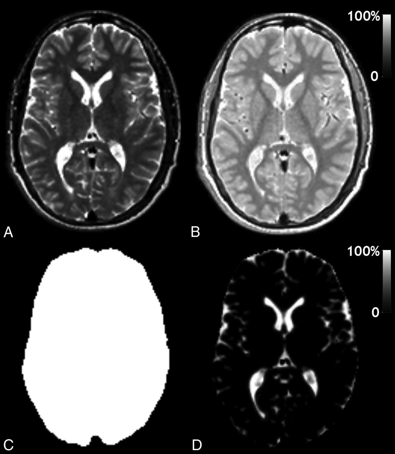 Typical output of the SyMRI software: A, Synthetic T2-weighted image of a section of the brain of one of the patients. This synthetic image was generated from the R1, R2, and PD maps in combination with a TE/TR = 100/4500 ms. B, PD map on a scale of 0%–100%, in which 100% corresponds to pure water at 37°C. C, Automatically generated intracranial mask (ICV). D, Automatically generated CSF partial volume map on a scale of 0%–100%. The brain parenchymal volume is calculated as the sum of all ICV minus the sum of all CSF. The brain parenchymal fraction is calculated as BPV/ICV.