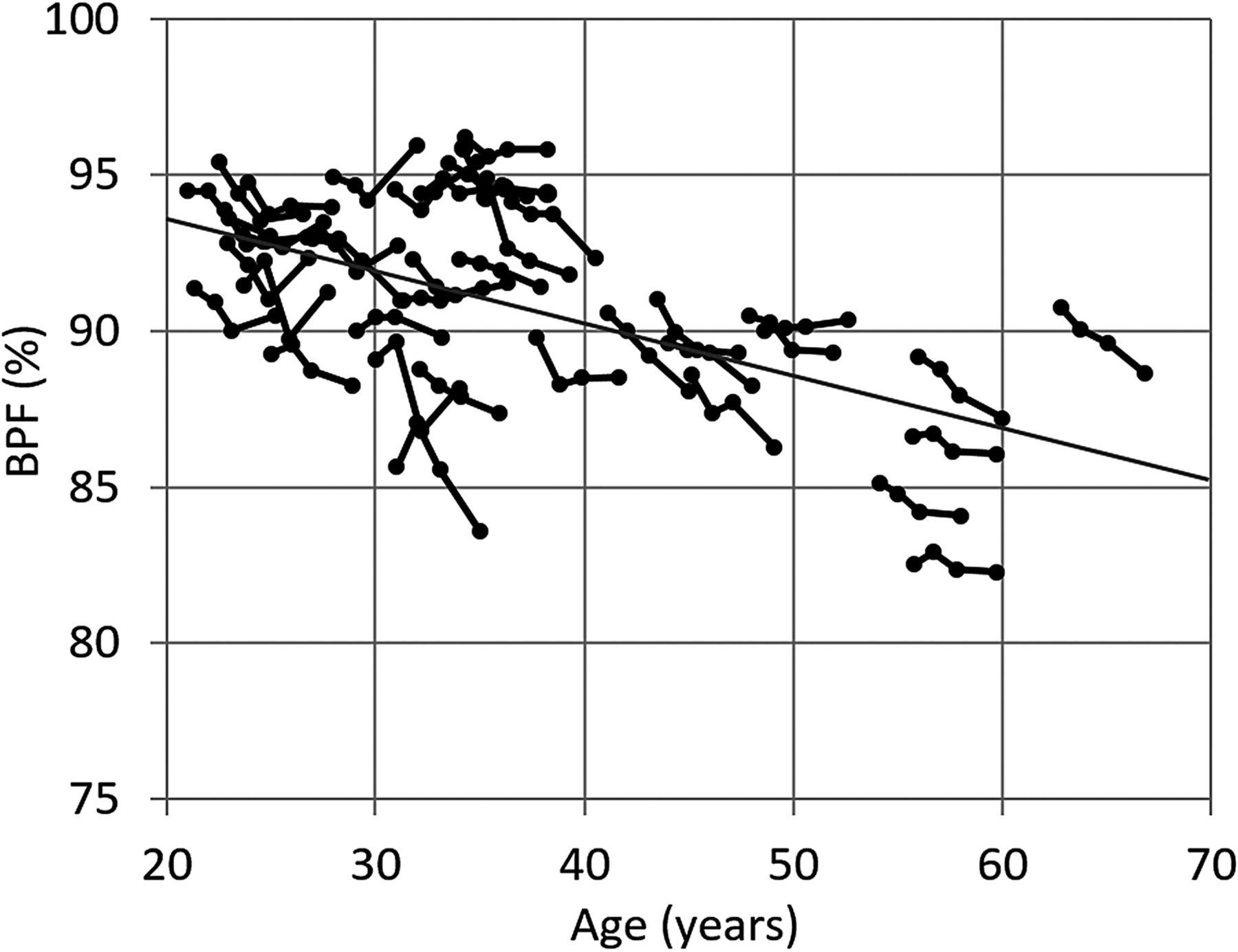 The average ICV of all subjects at all times was 1407 ± 151 mL; the average BPV was 1278 ± 129 mL, resulting in an average BPF of 90.9% ± 3.2%. The BPF of all subjects at all times is plotted in Fig 2. Linear regression on all data as a function of age showed a slope of BPF of −0.167%/year (95% confidence interval, −0.131 to −0.204; P < .001).